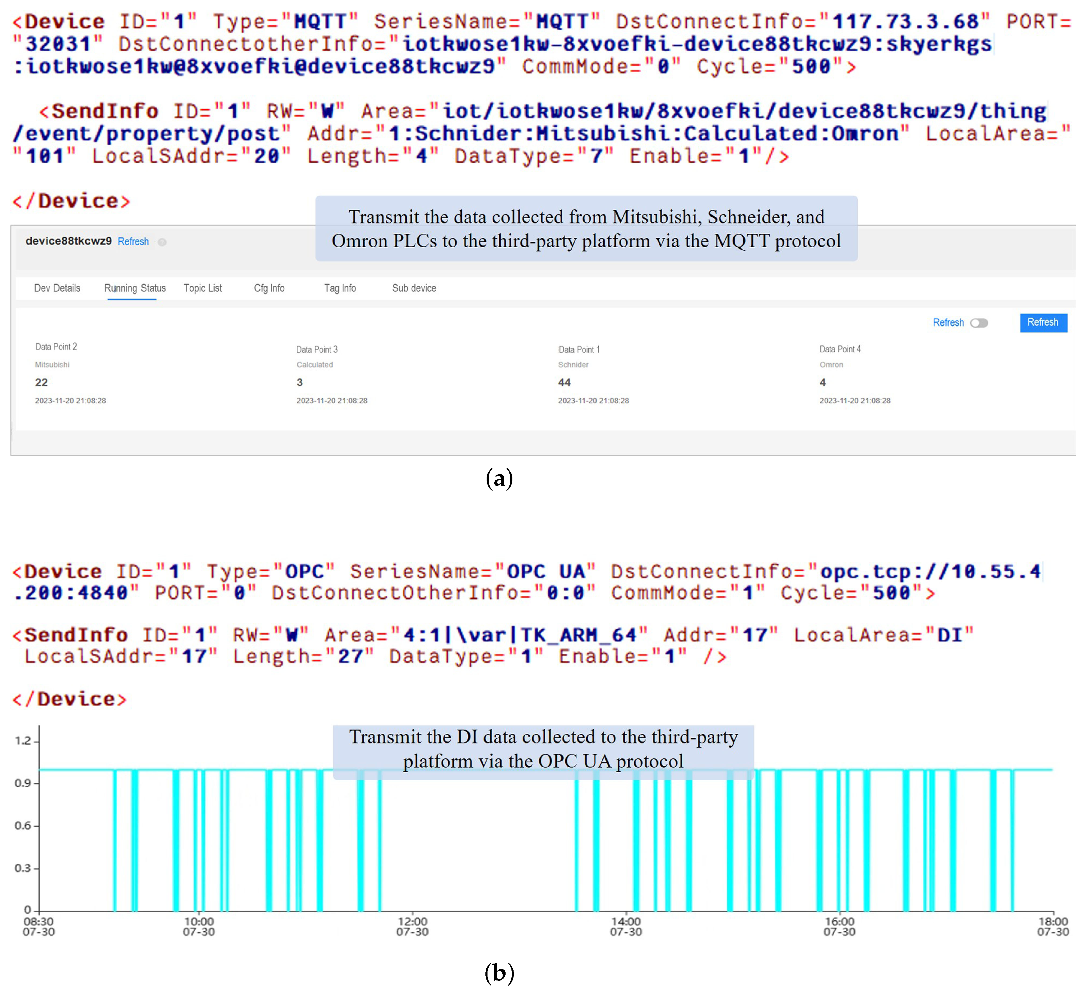 To validate the data integration capability of the GMGbox gateway with external systems, this study conducted systematic tests on its standard protocol interfaces. For the MQTT protocol test (Figure 10a), the gateway, acting as a client, successfully connected to a designated cloud server. Via XML configuration, it mapped heterogeneous data from Mitsubishi, Schneider, and Omron PLCs to a unified topic (thing/event/property/post), achieving the encapsulation and reliable transmission of multi-source device data. In the OPC UA protocol test (Figure 10b), the gateway, functioning as a client, connected to an independent OPC UA server and accurately wrote the acquired digital input (DI) data to the target variable node, verifying its interoperability at the industrial protocol level. The experiments demonstrate that the GMGbox gateway can efficiently convert acquired data into MQTT and OPC UA protocols through software-defined configuration and transmit it stably to third-party platforms, exhibiting excellent system compatibility and integration capabilities.