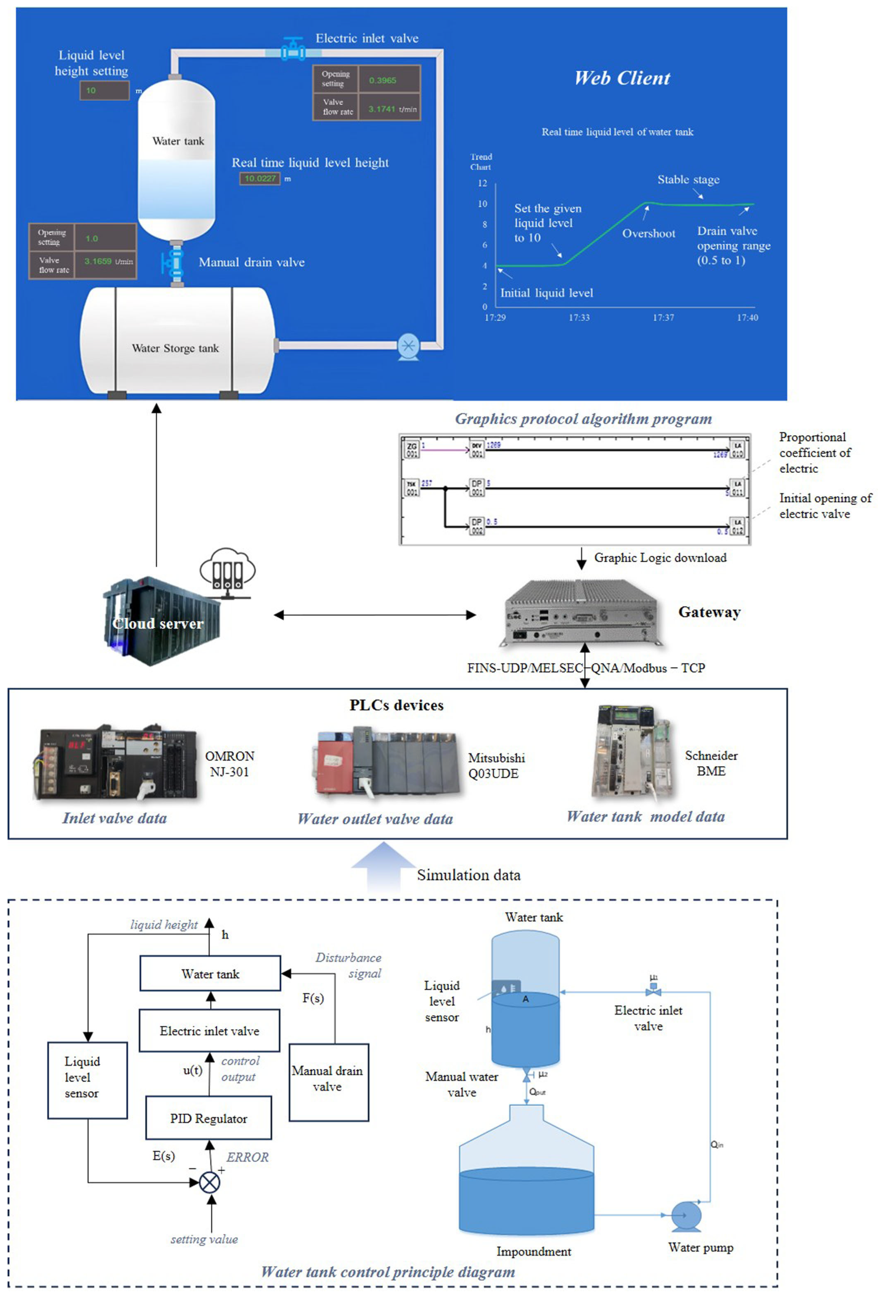 The experimental system employed three heterogeneous PLCs (i.e., Omron NJ300, Mitsubishi Q03UDE, Schneider BME) to simulate the inlet valve control, drain valve control, and tank simulation unit, respectively, realistically recreating a scenario with multiple heterogeneous devices common in industrial settings. The gateway hardware utilized a low-cost embedded architecture, loaded with graphical modeling-based protocol parsing programs for Fins, MELSEC-QNA, and Modbus to acquire data from each PLC in real time and store it in a local database. The cloud-based web remote monitoring server retrieves data from the gateway database, tracks the current status of several key process variables, and performs continuous monitoring.