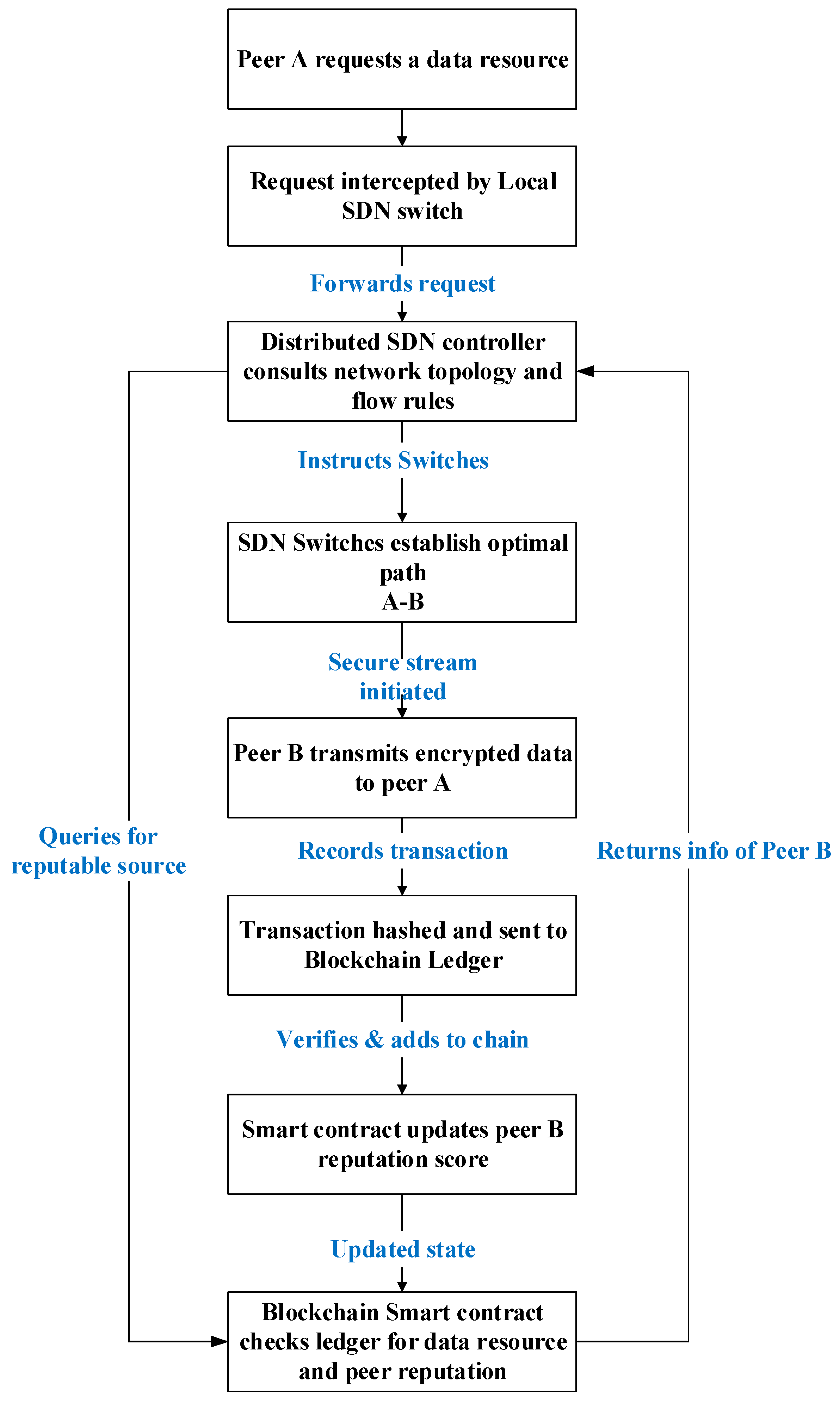 Figure 1, which presents a sequence diagram describing the interaction between the DSDN control plane and the blockchain ledger. The process begins when a peer (Peer A) requests a specific data block. This request is intercepted by the local SDN switch and forwarded to the distributed controller, which maintains a global view of the network. Before routing the request, the controller consults a blockchain-based smart contract to identify a trustworthy peer (Peer B) that holds the required resource. The smart contract uses historical transaction records to evaluate the reputation of Peer B. Once validated, the controller computes the optimal communication path and initiates data transfer over the DSDN-managed route. Upon successful transmission, the transaction is logged on the blockchain ledger, updating Peer B’s reputation score to encourage future cooperation and trust.