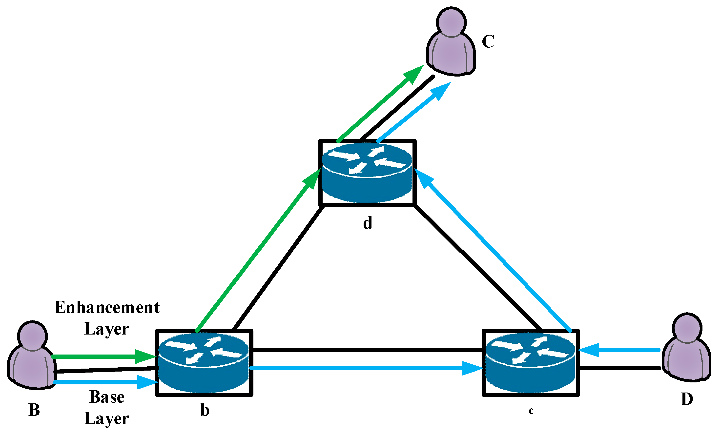 In contrast, the SDN-enabled QoS routing method allows for dynamic and differentiated path selection. The SDN controller continuously monitors the network and can select a path with higher available bandwidth, such as , for transmitting the crucial base layer of the SVC stream. Simultaneously, a shortest-path-first algorithm can be used to route enhancement layers along a faster, lower-latency path, like .