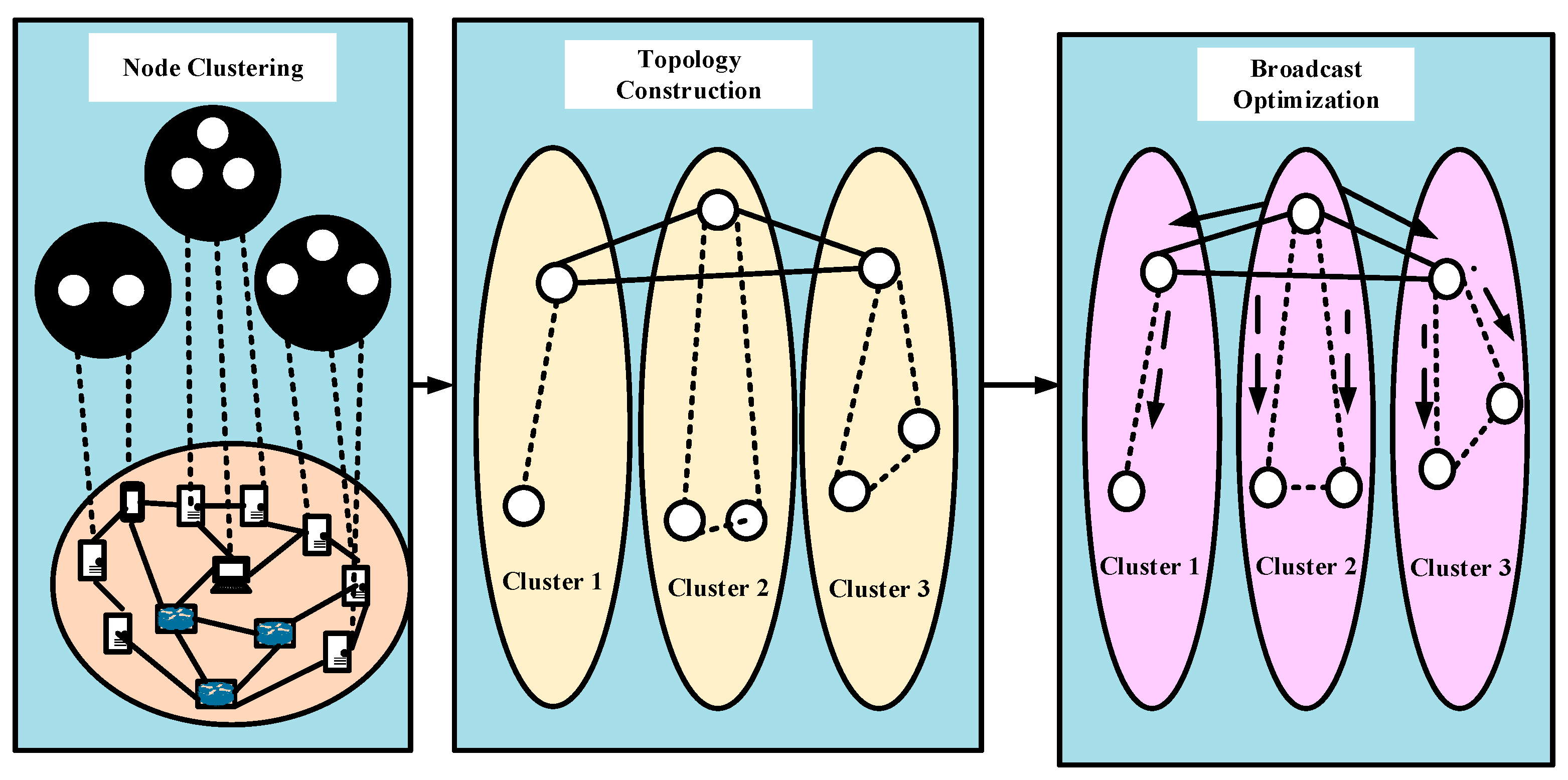 The BlockP2P protocol enhances blockchain operations over a P2P network through three core components: node clustering, topology creation, and broadcast optimization. The overall architecture of the BlockP2P protocol, which enhances blockchain operations over a P2P network, is summarized in