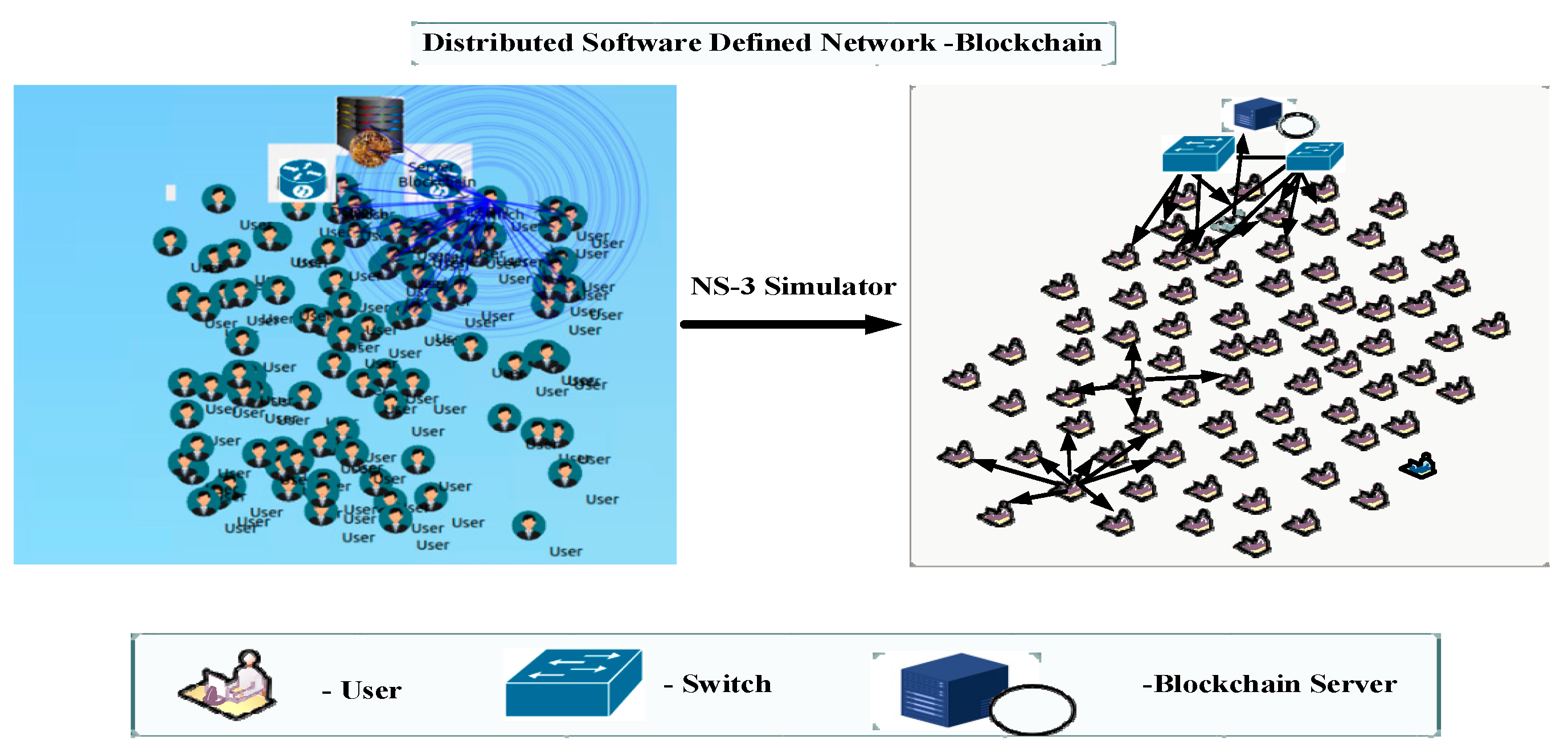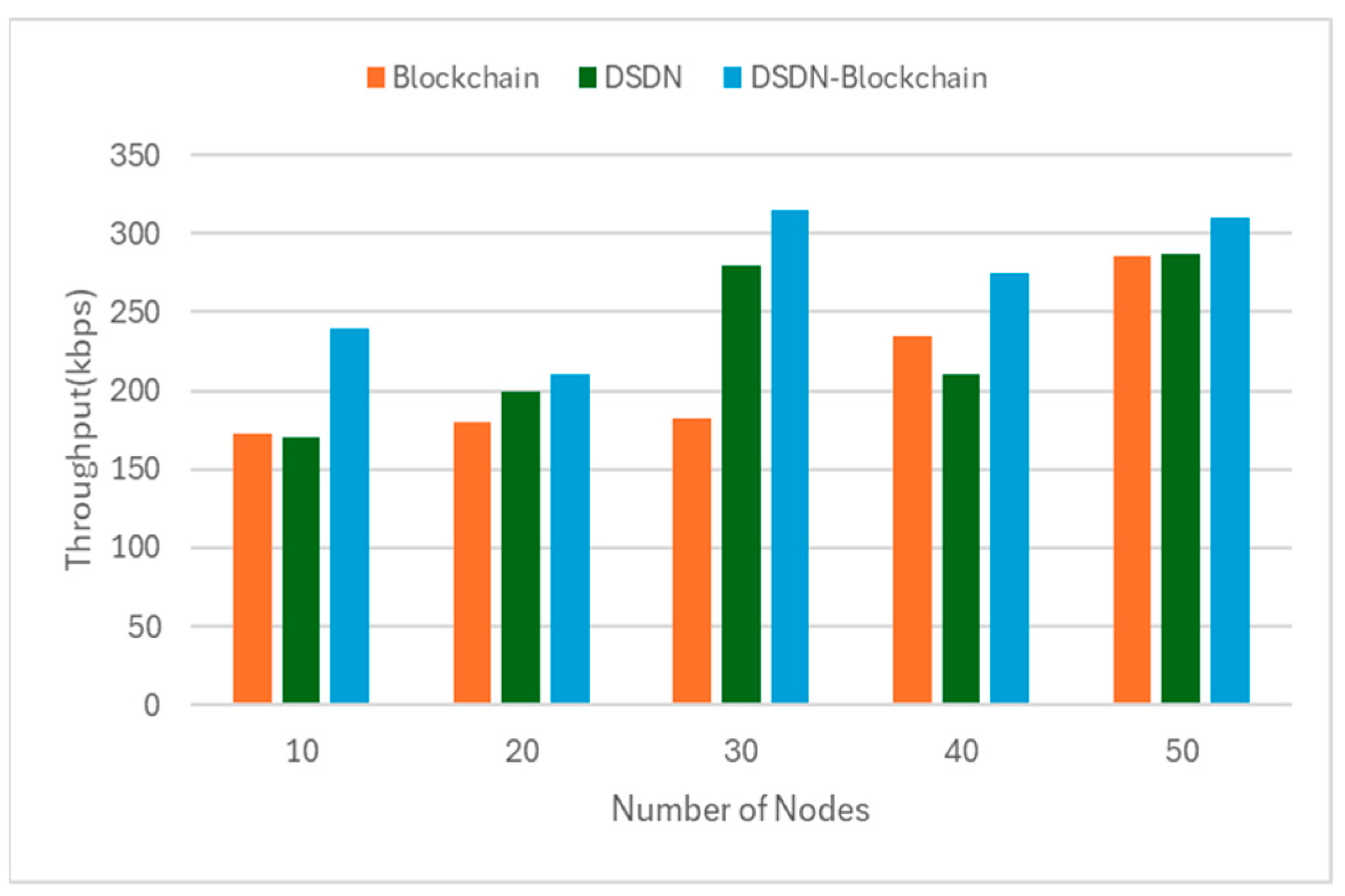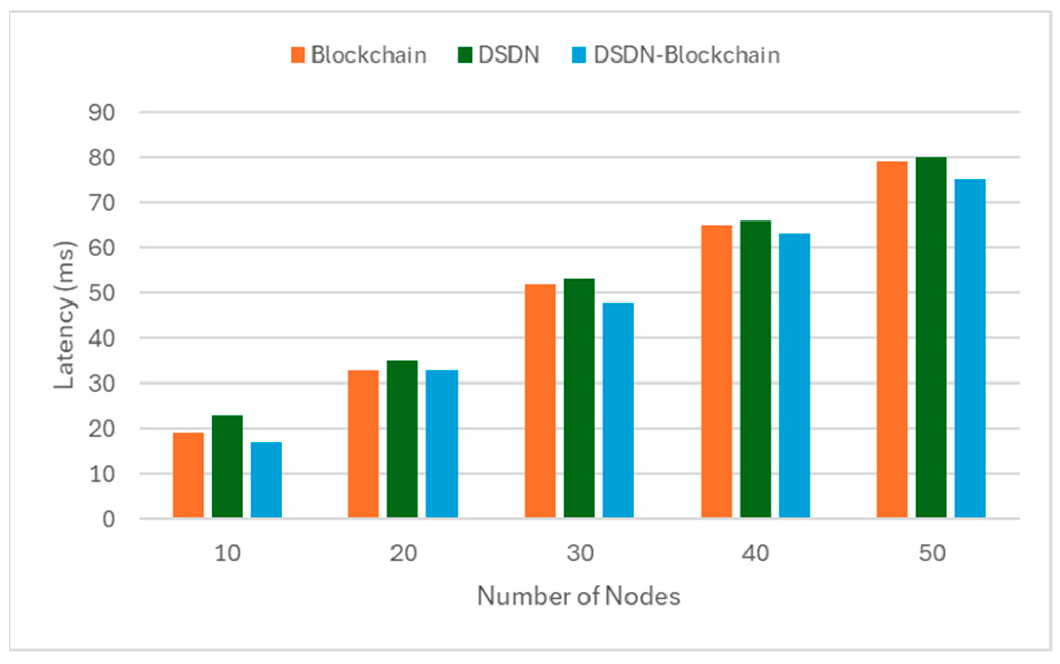 16] by re-evaluating the proposed framework under multiple configurations—blockchain-only, SDN-only, and the combined SDN–blockchain integration—within the same simulation environment and variable set. Unlike the prior comparative analysis, which focused on benchmarking performance across existing models, this study examines the implementation behavior and interaction dynamics of each configuration to provide deeper insights into scalability, security, and reliability.