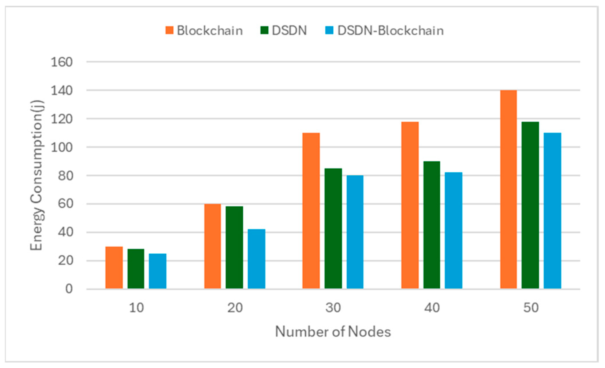 The experimental evaluation demonstrates that the hybrid DSDN–blockchain framework outperforms standalone approaches across all primary metrics: energy consumption, throughput, and latency. By integrating SDN’s adaptive control with blockchain’s secure transactions, the proposed system enhances quality of service, resource utilization, and scalability in P2P streaming. Specifically, the hybrid model demonstrated superior energy efficiency, consuming 110 joules at 50 nodes compared to 140 joules (blockchain-only) and 118 joules (DSDN-only), reflecting reductions of approximately 21% and 7%, respectively. For throughput, the hybrid system achieved 310 kilobits per second at 50 nodes, outperforming the blockchain-only model (285 kilobits per second) and the DSDN-only model (287 kilobits per second) by approximately 9% and 8%, respectively, in terms of latency; the hybrid model maintained the lowest end-to-end delay at 75 milliseconds, 5% lower than blockchain-only (79 milliseconds) and 6% lower than DSDN-only (80 milliseconds).