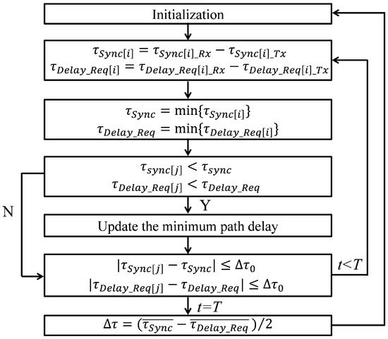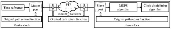 The flowchart of the MDPS algorithm is shown in Figure 2. First, the timestamps , , , and of the PTP packets are obtained by the slave clock through PTP. The i represents the packet sequence number. Then the path delay of Sync and Delay_Req packets, and , is calculated. The minimum path delay of PTP packets, and , is calculated as well. and are regarded as the reference path delay. The path delay of the subsequent receiving PTP packets, and , needs to be compared with the reference path delay. If the packet path delay is less than the reference path delay, the reference path delay is updated. Otherwise, it is used to calculate the time deviation. If the time deviation between the packet path delay and reference path delay is less than the set time deviation threshold , it is taken to participate in calculating the average path delay and . Otherwise, it is filtered out as random noise, such as jitter. Finally, the time deviation of PTP synchronization, , is calculated, and the slave clock is disciplined using during the disciplining period T. While T is not up, the slave clock continues to collect PTP packets. When T is up, the MDPS algorithm is initialized. The setting of depends on the network delay noise and the accuracy of the equipment’s internal clock. Usually, is one order of magnitude smaller than the network delay noise to suppress the network delay noise, and one order of magnitude larger than the time deviation of the equipment’s internal clock to ensure the statistical characteristics of clock performance.