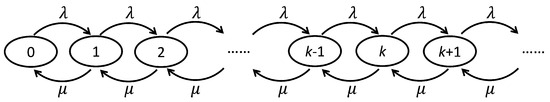 Due to the congestion in the network, it takes a certain amount of time to obtain the uncongested packet. Then we calculate this measurement time to prove the usability of the algorithm. Most routers have a store-and-forward function. Under normal working conditions, the probability of cache overflow is very small, and it can be approximately considered that the cache capacity is unlimited. Therefore, the M/M/1 queuing model is introduced. It is assumed that the arriving data flow of the router follows a Poisson process with a parameter of , and the length of the data packet follows a negative exponential distribution. The average service rate is , and the service window is 1. The number of packets that stay in the switch increases with the arrival of the packets and decreases with the completion of packet processing. Thus, this system can be regarded as a process of birth and death. The state diagram is shown in Figure 3.