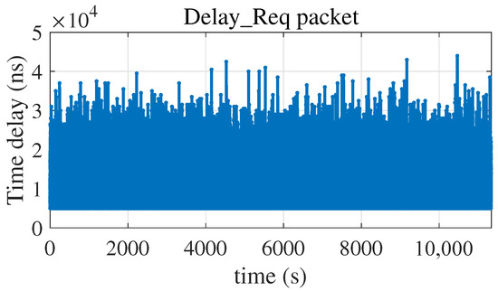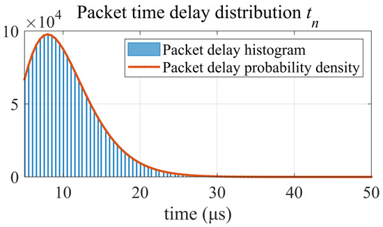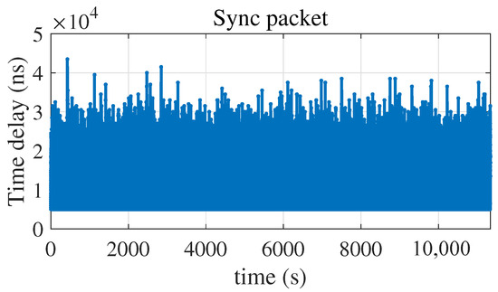 According to the analysis in Section 2.2, the delay of the PTP packet is the network packet delay . The average arrival rate , and the average service rate of the packet can be obtained based on the packet length and arrival time. According to the number of network hops and the probability density distribution function of the packet delay, we select the main range of the packet delay as [ s, s]. After simulation, the packet delay and delay distribution of the Sync and Delay_Req can be obtained as shown in Figure 4, Figure 5 and Figure 6.