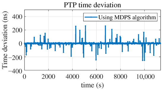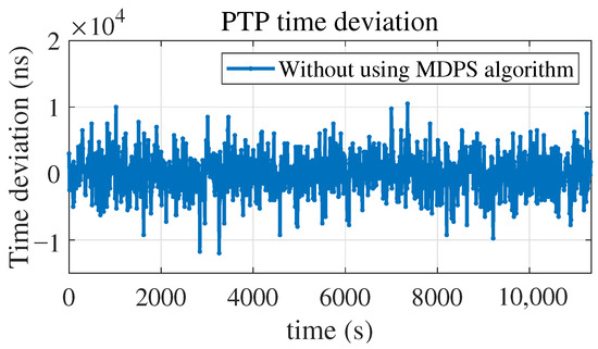 Without adopting the MDPS algorithm, the time deviation between the slave and master clocks is measured through PTP. The results show that the time deviation range of PTP is from −12.0 µs to 10.5 µs, with an average value of −42.5 ns and a standard deviation of 2.9 µs, as shown in Figure 7.