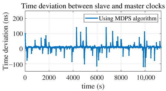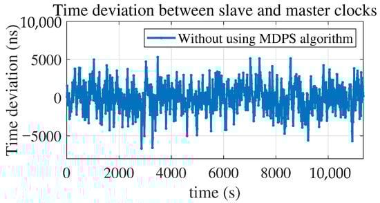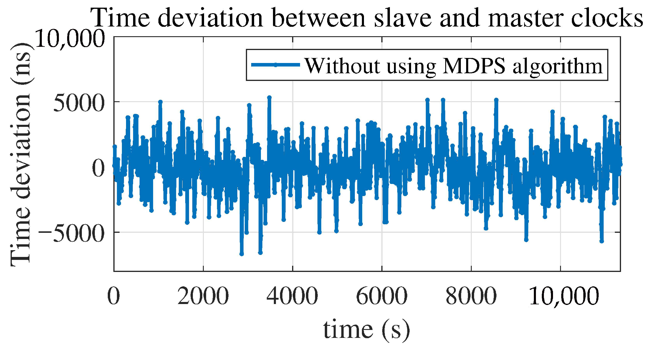 The period of the Sync and Delay_Req packets of PTP is set to 1/16 s, and the disciplining period T of the slave clock is set to 10 s. For comparison, we calculate the time deviation between the slave and master clocks, respectively, in the cases of using and not using the MDPS algorithm.