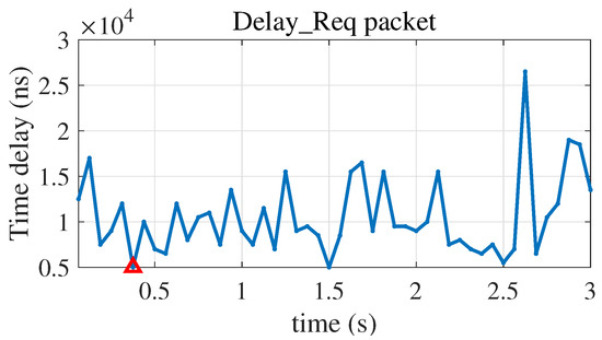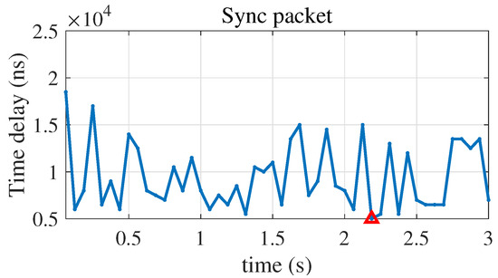 In Figure 7 and Figure 8, it can be seen that the standard deviation caused by the network noise is on the order of 2 µs. The time drift of the slave clock is 10 ns, caused by the internal clock within the disciplining period. According to the analysis in Section 2.2, it is assumed that the packet delay screening threshold = 200 ns. The minimum packet delays in Figure 4 and Figure 5 are screened in real time through the algorithm. The results show that the time delay of the Sync packet reaches the minimum value at 2.1875 s; that is, the Sync packet with the minimum delay is obtained at the 35th packet, and the Delay_Req packet reaches the minimum value at 0.375 s. That is, the Delay_Req packet with the minimum delay is obtained at the sixth packet, as shown in Figure 9 and Figure 10. The time deviation range of PTP is from −254.5 ns to 260.6 ns, with an average value of −0.7 ns and a standard deviation of 30.8 ns, as shown in Figure 11.