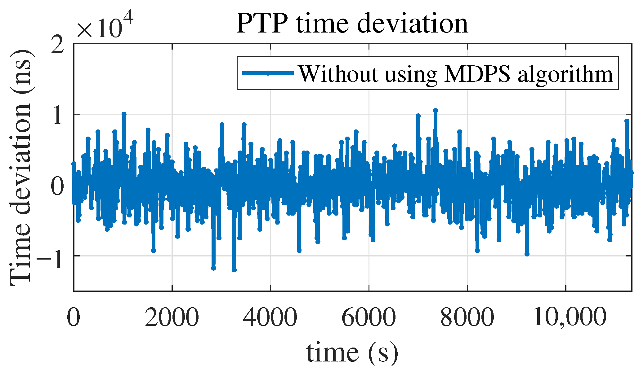 Without adopting the MDPS algorithm, the time deviation between the slave and master clocks is measured through PTP. The results show that the time deviation range of PTP is from −12.0 µs to 10.5 µs, with an average value of −42.5 ns and a standard deviation of 2.9 µs, as shown in