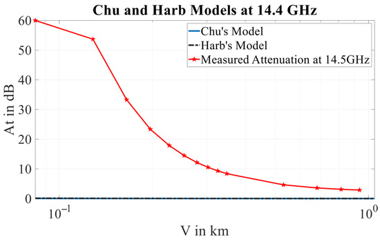 Chu’s and Harb’s predictions compared to measured attenuation at 14.4 GHz.