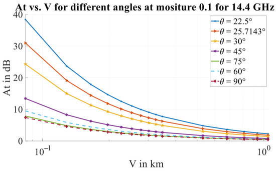 Predicted attention at 0.1 moisture content for 14.4 GHz at different elevation angles and visibility levels.