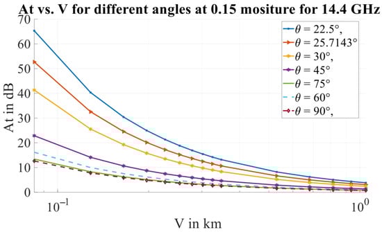 Predicted attention at 0.15 moisture content for 14.4 GHz at different elevation angles and visibility levels.