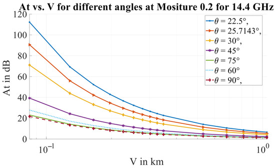 Predicted attention at 0.2 moisture content for 14.4 GHz at different elevation angles and visibility levels.