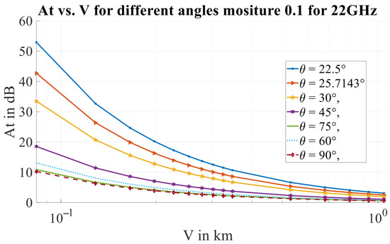 Predicted attention at 0.1 moisture content for 22 GHz at different elevation angles and visibility levels.