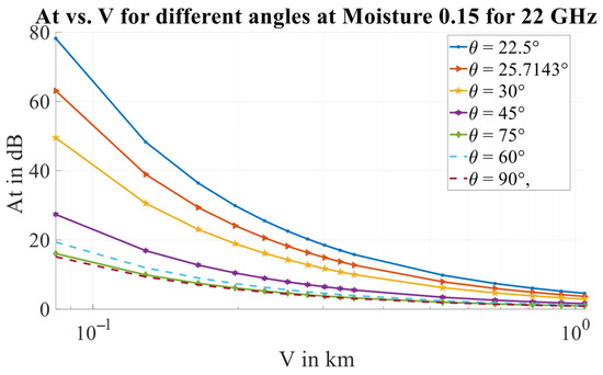 Predicted attention at 0.15 moisture content for 22 GHz at different elevation angles and visibility levels.