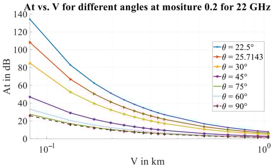 Predicted attention at 0.2 moisture content for 22 GHz at different elevation angles and visibility levels.