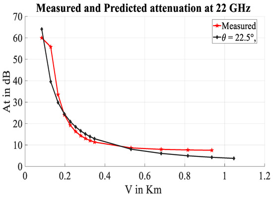 The earth–satellite link at an elevation angle of 22.5 degree at a dust storm height (h1) of 2.4 km is equivalent to 6.2 km slant path length. Hence, the predicted attenuation using the proposed model of dust storm intensity variations on earth–satellite link at an elevation angle of 22.5 degrees and dust storm height of 2.4 km is compared with the measurement in Figure 12. Figure 12 shows that when visibility exceeds 0.6 km, the prediction slightly underestimates attenuation. In the mid-range (0.6 km to 0.3 km), there is close agreement. At lower visibility levels below 0.3 km, the prediction again slightly underestimates the measured attenuation.