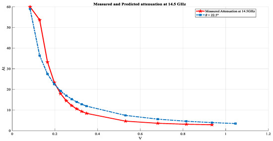 Figure 13 shows another comparison between measured and predicted total attenuation using the proposed model and the measured attenuation from BIA2_MANCHIA, which operates at 14.4 GHz over 7.6 km [24]. The comparison utilizes measurements and predictions based on Equation (18) at an elevation angle of 22.5 degrees and a dust storm height (h1) of 2.91 km. Figure 13 shows visibility that exceeds 0.5 km, where the prediction tends to overestimate the attenuation. In the mid-range (0.5 km to 0.2 km), the measurements and predictions align well. At visibility below 0.2 km, the predicted attenuation slightly underestimates the measured values for a frequency of 14.4 GHz.