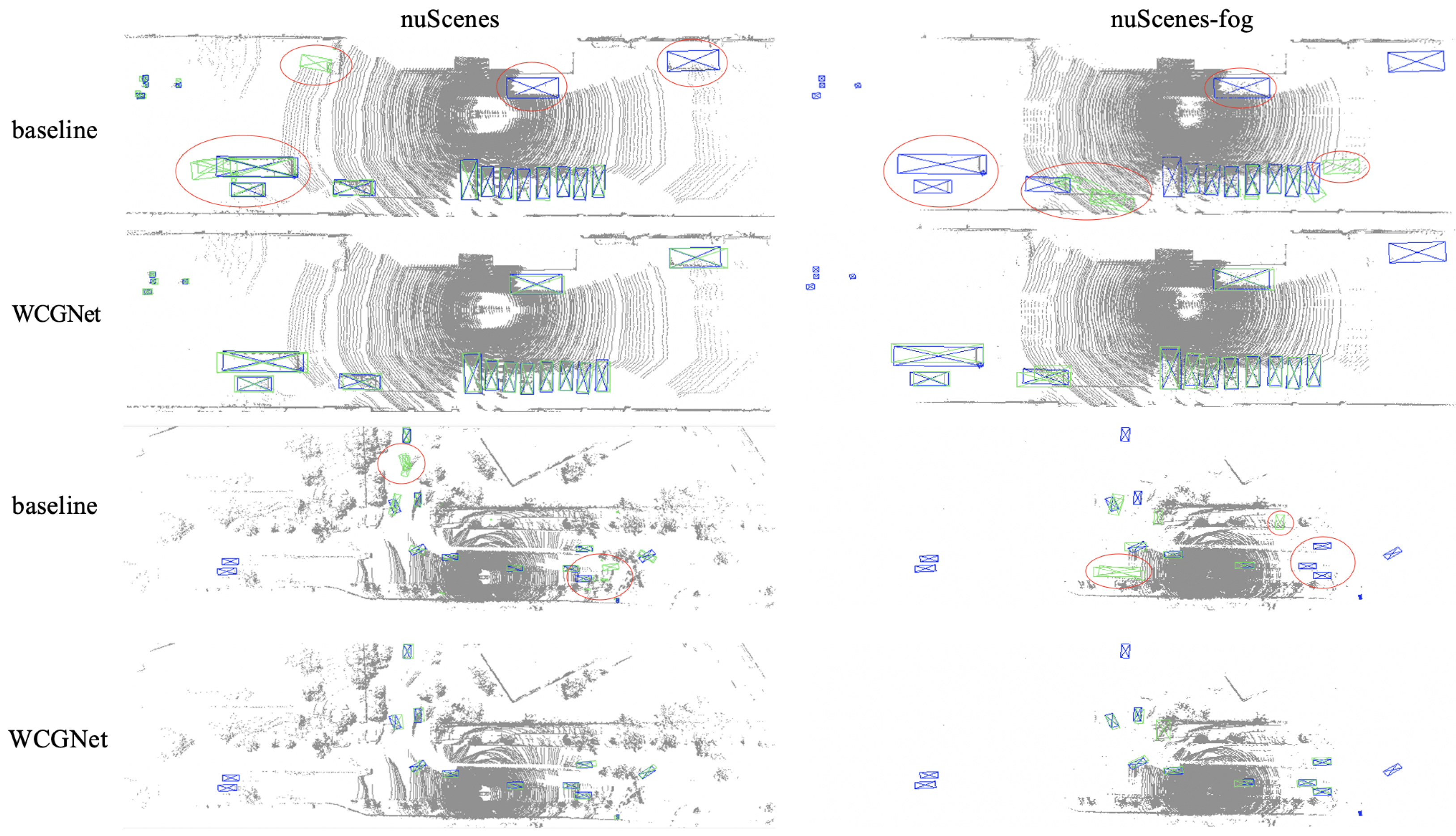 - A synthetic foggy point cloud dataset, nuScenes-fog, is constructed based on the nuScenes dataset. Extensive experiments are conducted on both nuScenes and nuScenes-fog, demonstrating the proposed method’s superior robustness and detection performance under foggy conditions. Furthermore, evaluation on the STF multi-weather dataset confirms the model’s strong adaptability across diverse weather scenarios.