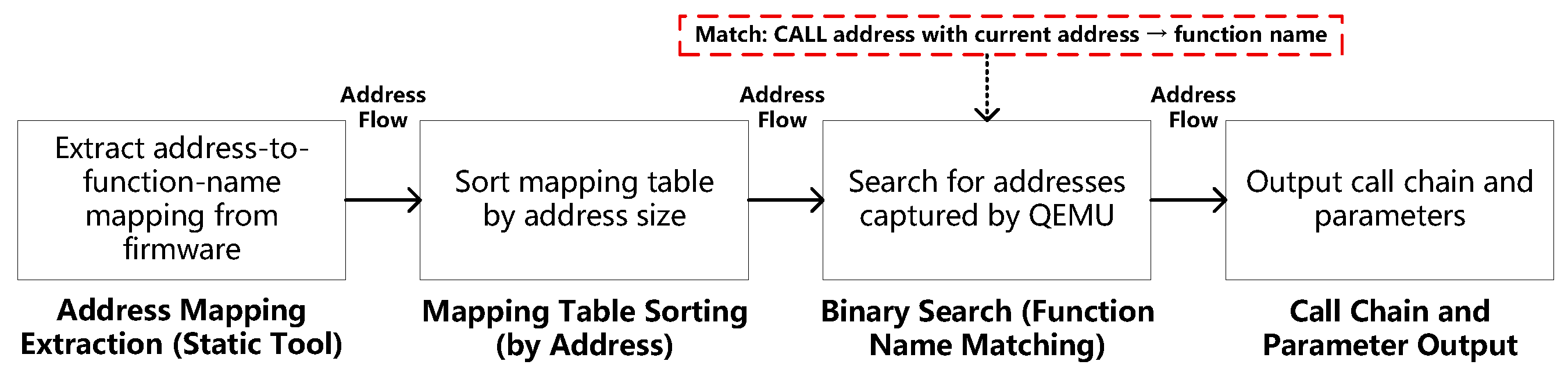 Furthermore, existing dynamic analysis techniques typically rely on source-level instrumentation or debugging interfaces (such as AFL++ or GDB) [25,26], which are unavailable in closed-source environments. The firmware execution process is automatically initiated by the boot image, making it difficult for analysts to inject monitoring points without disrupting the normal execution flow. This limitation prevents effective runtime observation of function call operations, such as ×86 CALL instructions.