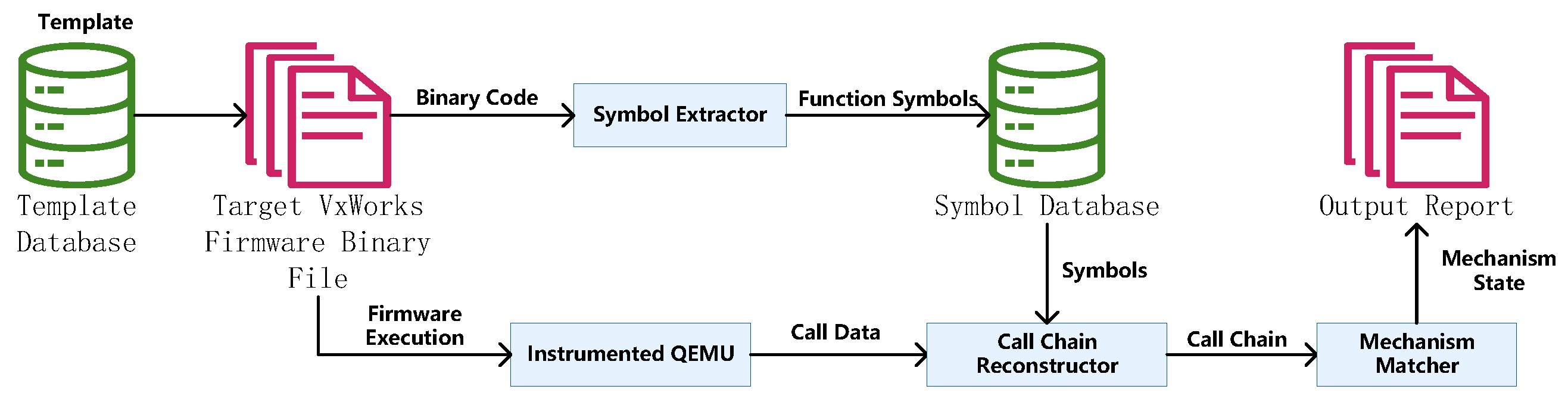 The system integrates these modules into a coordinated workflow. The process begins with static analysis to build the template database, while the symbol extraction module generates a symbol database from the firmware binary. During emulation, the instrumented QEMU captures runtime data, which is then processed by the call chain reconstruction module using the symbol database. The reconstructed call chains are sent to the mechanism matching module for comparison with the templates, producing the final detection results. This modular design ensures that each component efficiently handles the output of the previous stage, forming a smooth and effective detection workflow.