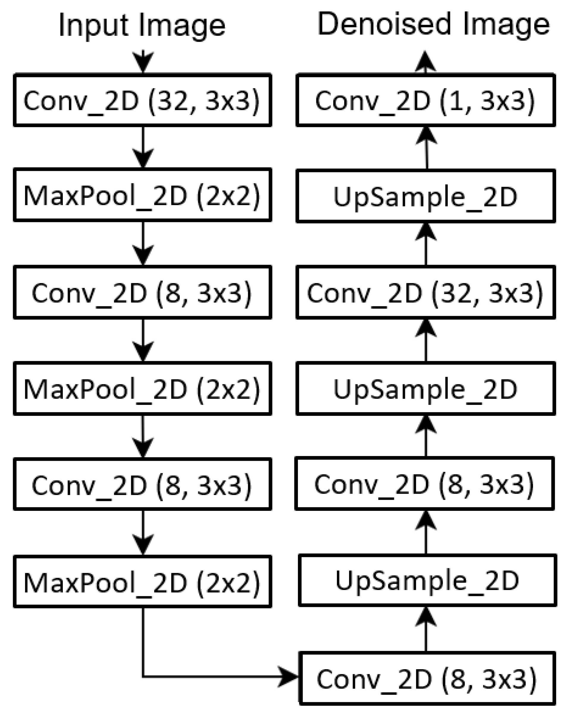 The relatively shallow and straightforward denoising model architecture used by Senapati et al. [9] is shown in Figure 1. Similarly, the decoder part only consisted of three convolutional layers, followed by up-sampling, and finally, an additional convolutional layer was added to reconstruct the image. The details of the single-channel model are presented in Table 1, while those of the RGB three-channel model are shown in Table 2.