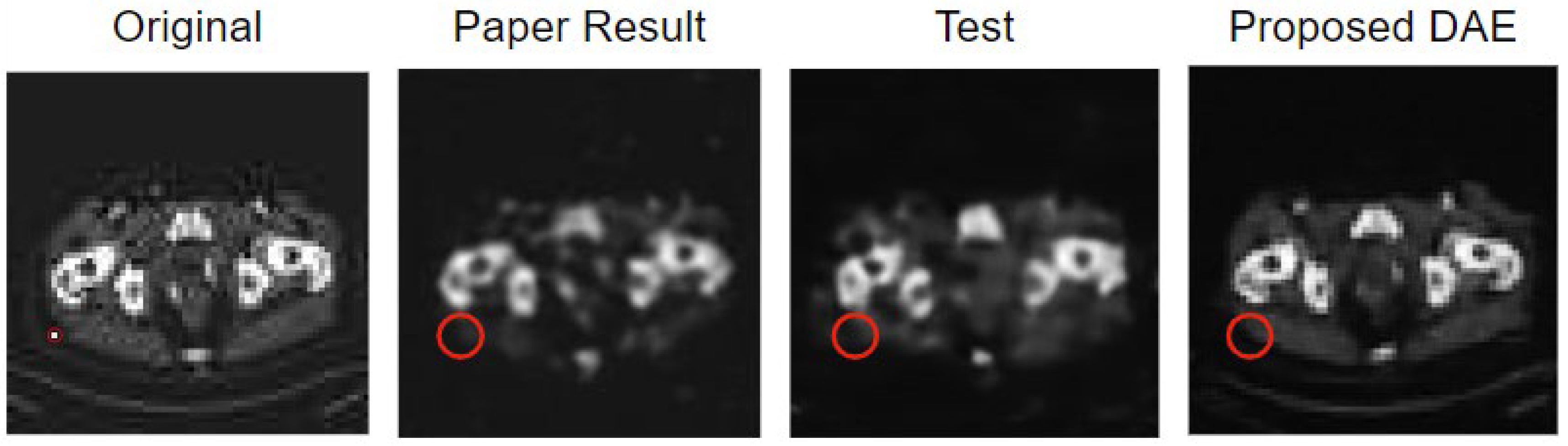Experiments were conducted in this study using the AbdomenCT dataset from the Kaggle Medical MNIST, following the experimental set-up by Senapati et al. [9] to validate the original model’s accuracy. The model architecture continued to be modified based on the results of each training session, which led to improved Peak Signal-to-Noise Ratio (PSNR) values. The original dataset image, results of the original study, the experimental results that validated the original model, and the results after optimizing the model are shown from left to right in Figure 2. Meanwhile, the results of denoising from the original study, the validation experiment, and the optimized model are listed in sequence in Table 3.
