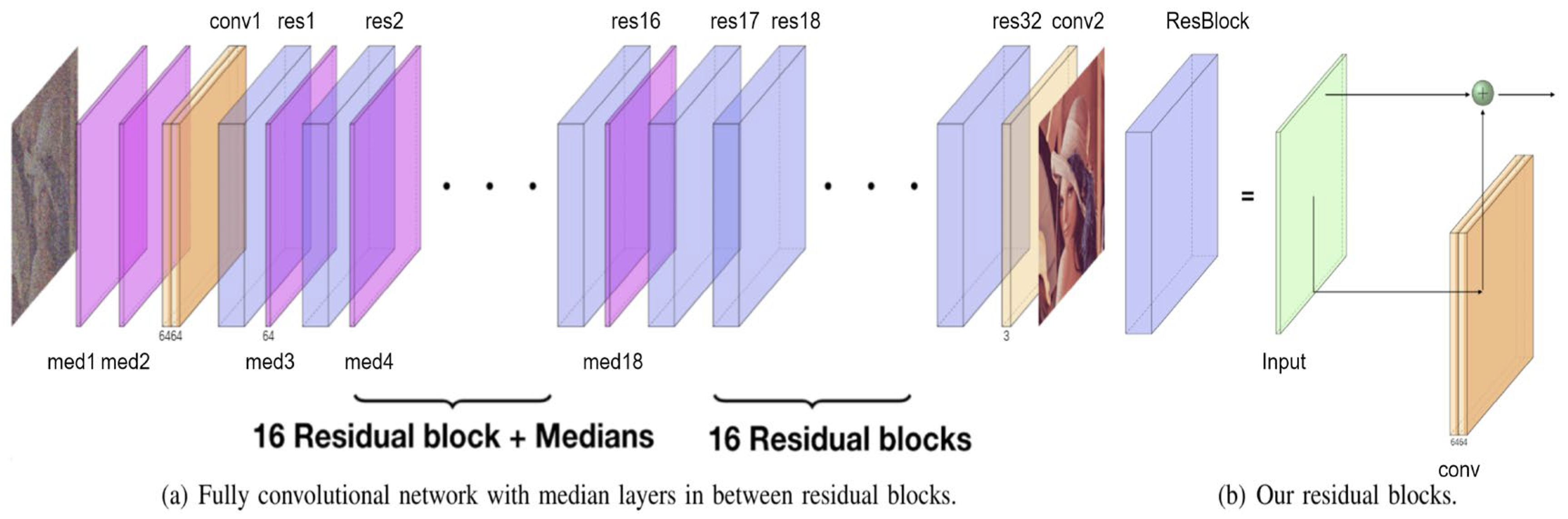 Chen et al. [5] used the Noise2Noise framework for denoising, disregarding the need to obtain many clean images and making it unnecessary to train with many noisy images and corresponding clean images. The original data only requires some original images to which noise is added to generate multiple noisy images to serve as input images and target images for training the deep learning model. When using the Noise2Noise framework, it is necessary to choose an appropriate deep neural network structure, appropriate noise type, and loss function to defend an image against a one-pixel attack. SRResNet (as shown in Figure 6) is used as the deep learning structure. This generator network in SRGAN is mainly used for image super-resolution (SR) tasks. It improves the image quality by learning the mapping relationship between high-resolution and low-resolution images. This model is mainly constructed of 16 residual blocks. The network structure does not restrict the size of the input image, and the size of the input and output images is the same. This network model can remove Gaussian noise, impulsive noise, Poisson noise, and text. It is suitable for the defense models of many different types of source data because it constructs safe applications. The loss function used here is the annealed version of the L0 loss function, which is based on the following formula;