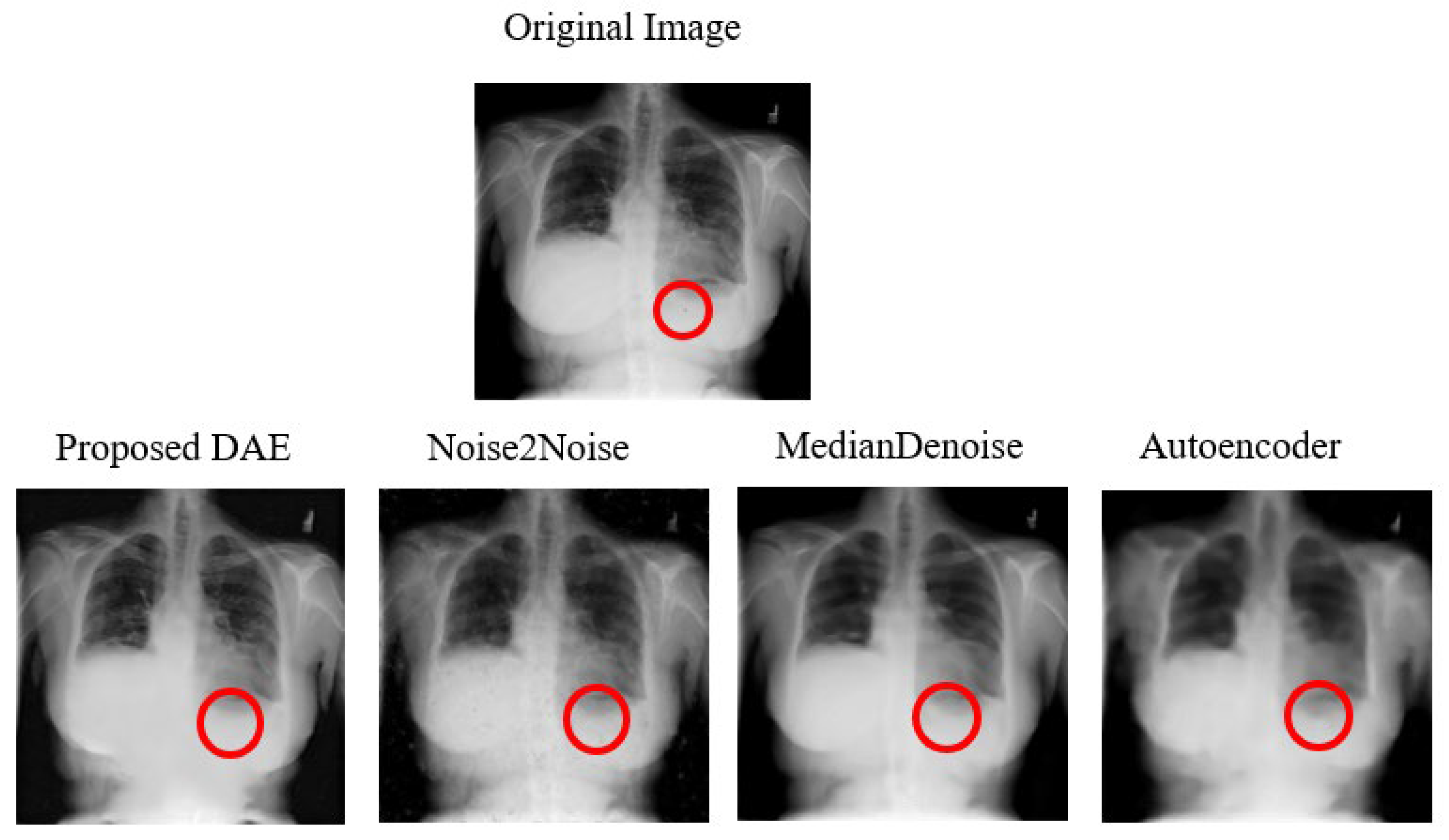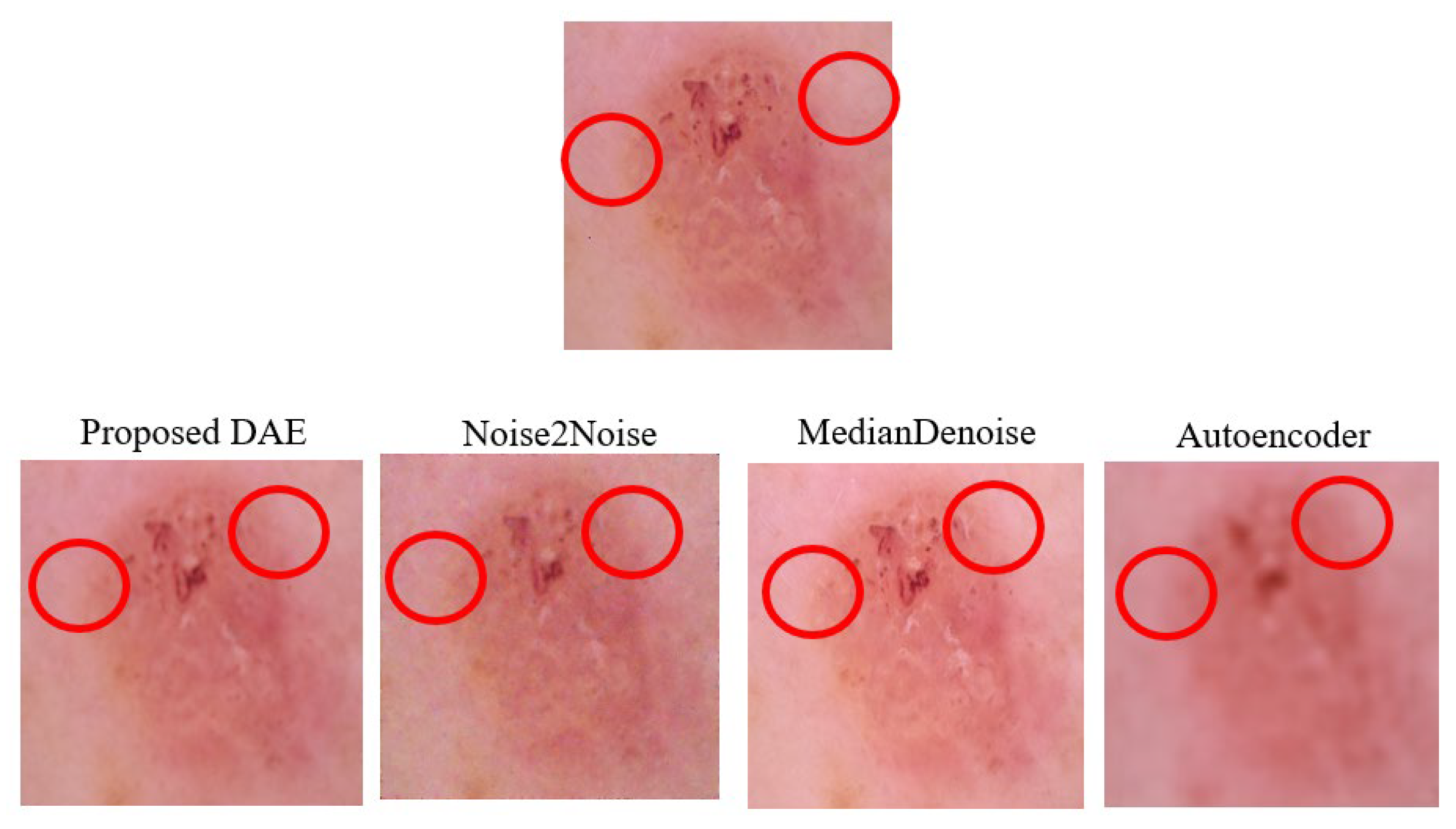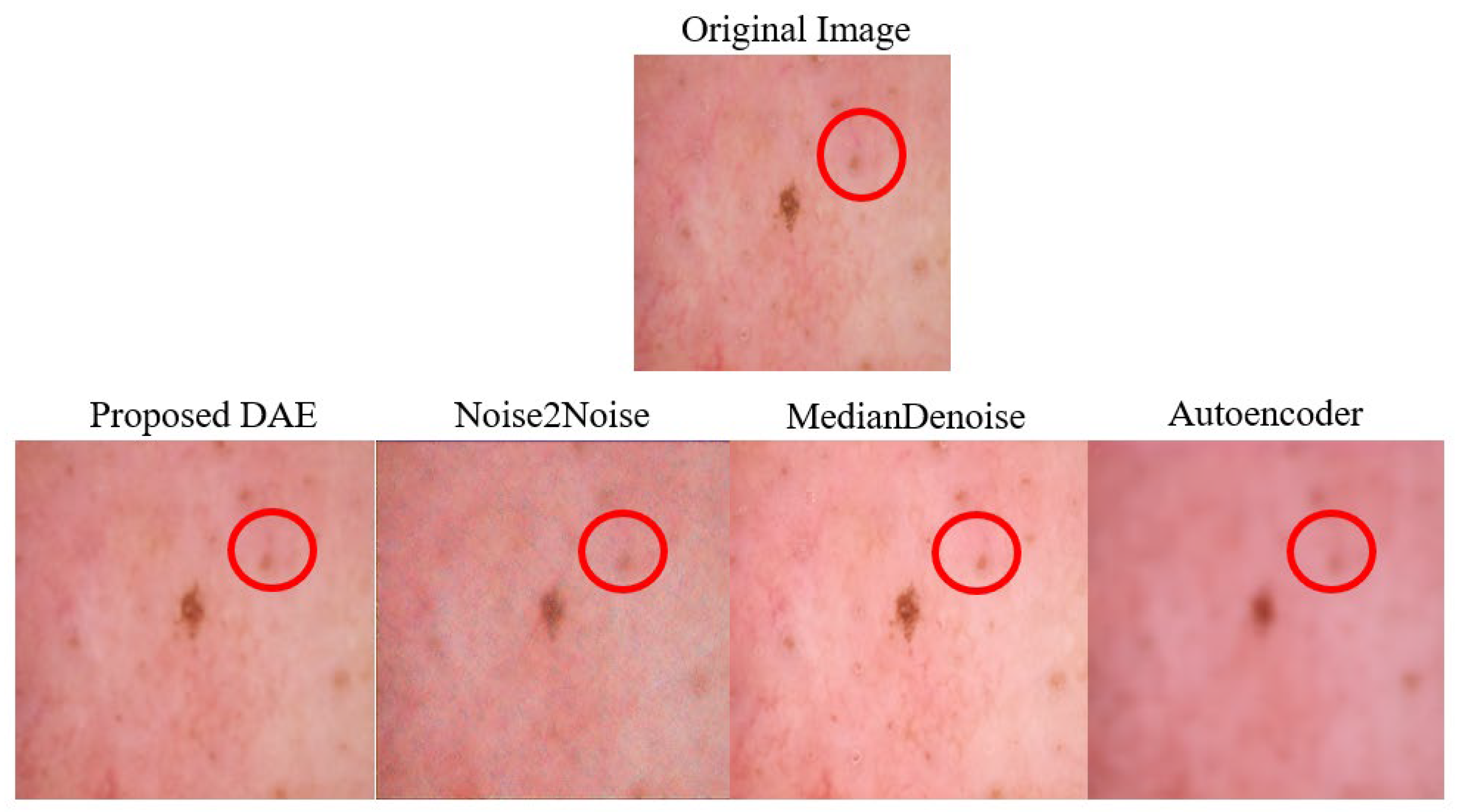 This model refers to the one proposed by Senapati et al. [9] and adjusts the architecture of the original model. An autoencoder is a neural network model primarily used for unsupervised learning and feature learning. Its core concept entails encoding and decoding input data to learn a compressed representation of it while preserving important information. The denoising autoencoder (DAE) used in this study is a variant of autoencoders that are specifically designed to handle noisy data. Unlike traditional autoencoders, the primary goal of DAEs is to restore original noise-free images by learning from noisy input images. They are widely applied to real-world image processing tasks due to their ability to adapt and automatically learn the features of diverse data.