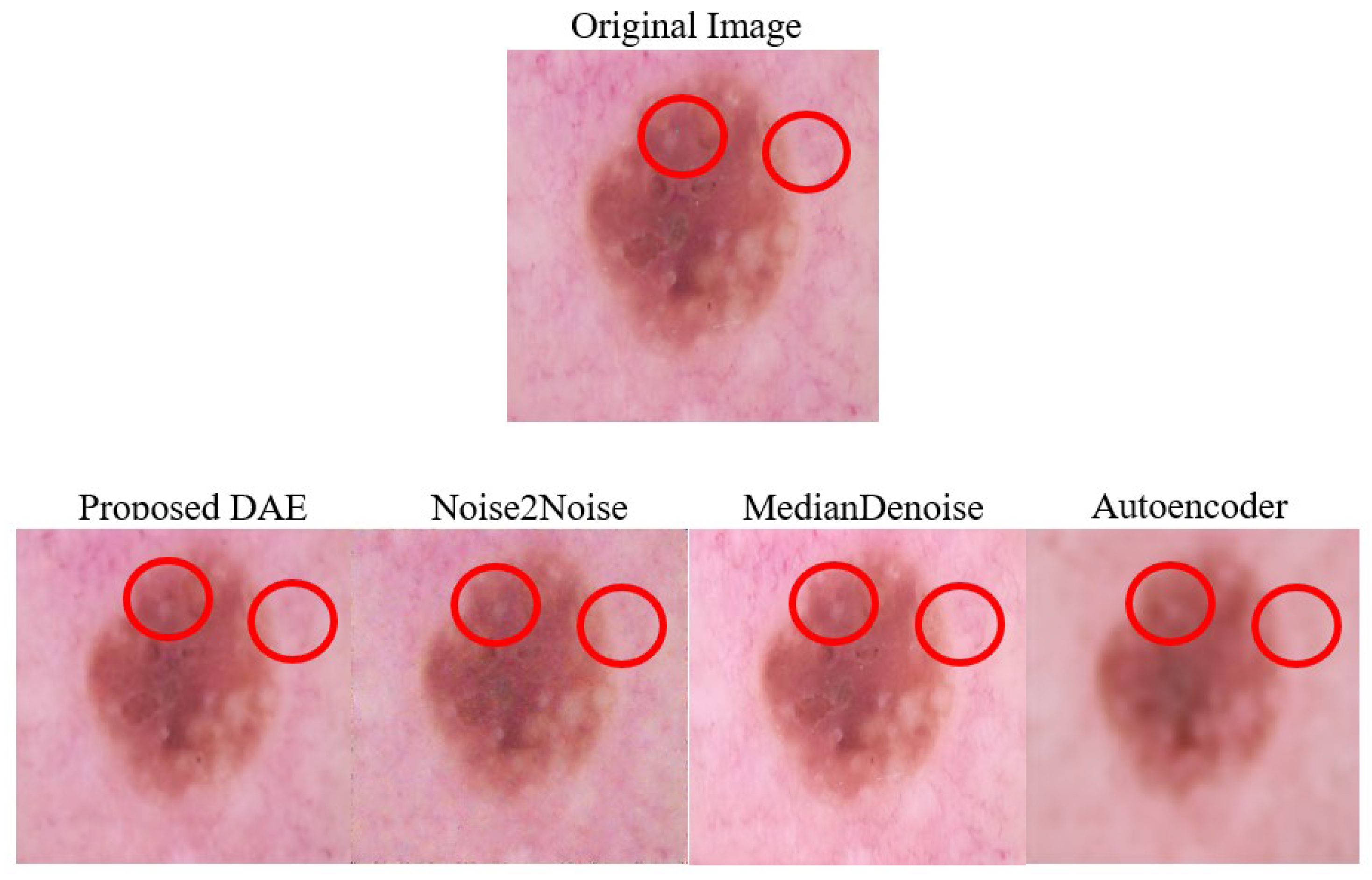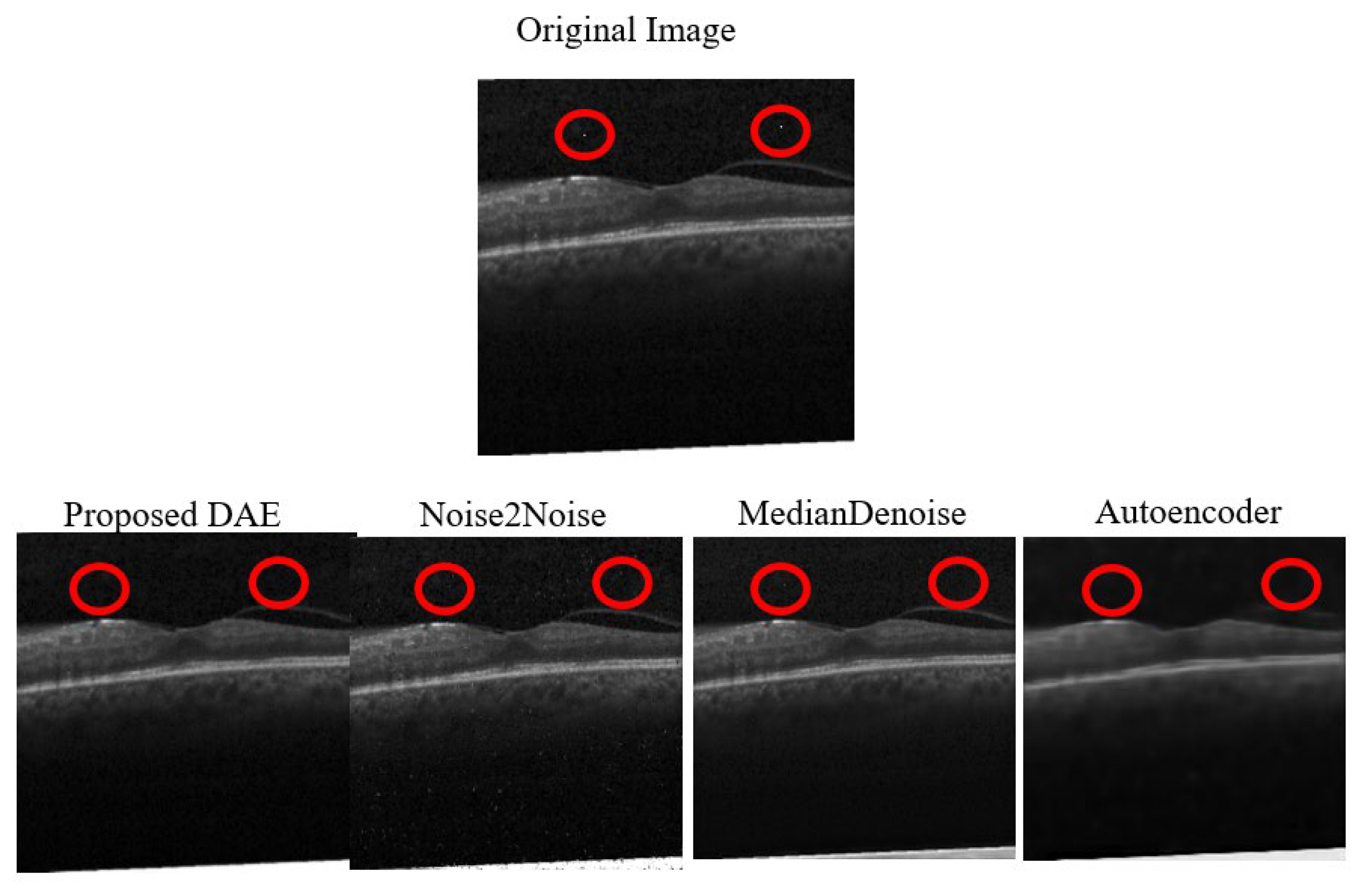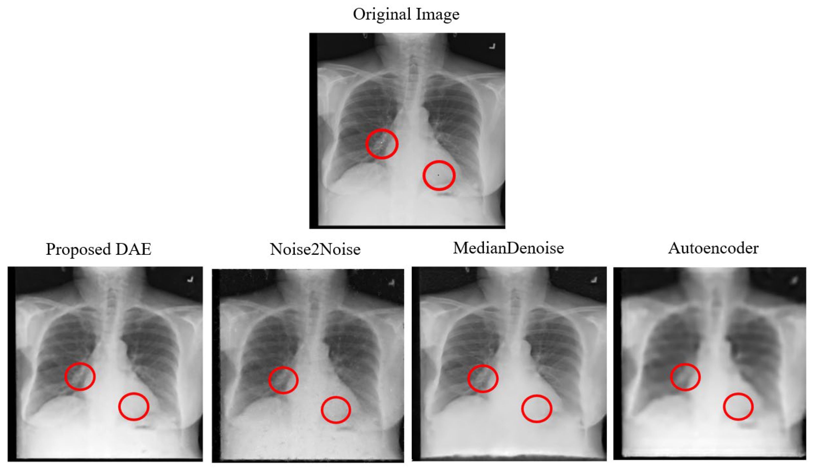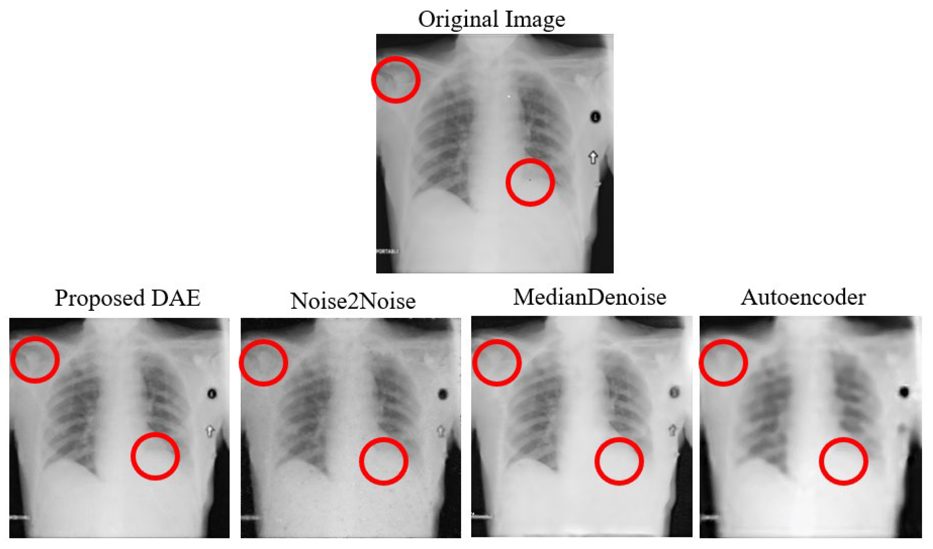 This model refers to the one proposed by Senapati et al. [9] and adjusts the architecture of the original model. An autoencoder is a neural network model primarily used for unsupervised learning and feature learning. Its core concept entails encoding and decoding input data to learn a compressed representation of it while preserving important information. The denoising autoencoder (DAE) used in this study is a variant of autoencoders that are specifically designed to handle noisy data. Unlike traditional autoencoders, the primary goal of DAEs is to restore original noise-free images by learning from noisy input images. They are widely applied to real-world image processing tasks due to their ability to adapt and automatically learn the features of diverse data.