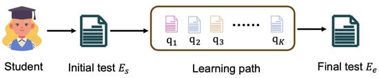 Learning Path Recommendation (LPR) systems leverage real-time analysis of students’ knowledge acquisition to construct personalized learning trajectories tailored to their specific needs [1]. By dynamically adapting instructional content and methodologies, these systems not only enhance learning efficiency but also foster deeper engagement and intrinsic motivation, thereby significantly augmenting overall educational outcomes. As AI applications become increasingly pervasive in education, the interpretability and fairness of recommendation systems have also received growing attention [2,3,4]. An ideal LPR system should not only be effective but also transparent, trustworthy, and fair. In recent years, research in the field of LPR has exhibited a noticeable upward trend. Some researchers have applied knowledge tracing (KT) to LPR. The KT model has the ability to predict students’ knowledge status, so as to enhance the ability of the LPR system to dynamically evaluate students’ knowledge status and adjust the path based on this [5,6]. However, the existing KT model only has the ability of single-step prediction, that is, it can only predict the knowledge state of students at time , which is difficult to meet the requirements of LPR for multi-step prediction of students’ knowledge status.