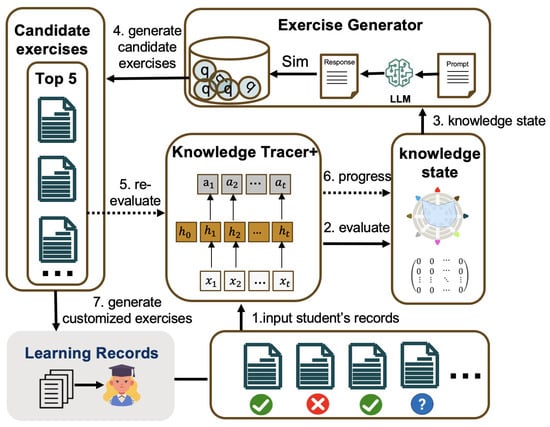where corresponds to a trainable algorithm or model, and represents the ith student. This formulation aims to predict the next learning step for each student, enabling the system to dynamically adapt to their evolving knowledge states and optimize their learning trajectories.