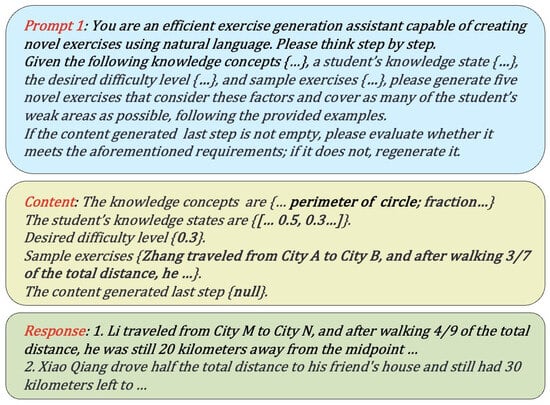 LLMs refer to ultra-large-scale neural networks trained via deep learning techniques, capable of comprehending and generating human language with remarkable fluency. These models are typically pre-trained on extensive textual corpora, allowing them to capture nuanced linguistic patterns and contextual dependencies. Owing to their transformative impact across a wide range of natural language processing tasks—such as text generation and machine translation—LLMs have garnered increasing attention in the domain of recommendation systems [38,39]. Prompt templates serve as an effective mechanism to enhance the interpretability and reasoning capabilities of LLMs; when carefully crafted, they can guide the model to produce responses that are not only coherent but also closely aligned with task-specific objectives [40]. Qwen (version 2.0; Alibaba Cloud, Hangzhou, China) is a language model introduced by Alibaba Cloud, and we have deployed this model on our servers with a parameter size of 32 billion. As illustrated in Figure 3, the prompt template is carefully designed to guide the LLM in its role as an intelligent exercise generation assistant. The blue section highlights that the LLM should focus on students’ evolving understanding of specific knowledge concepts and the desired exercise difficulty. Newly generated reference exercises should adhere to the format provided in the examples. For each student with multiple weak knowledge concepts, the LLM aims to generate exercises covering as many of these knowledge concepts as possible to optimize knowledge improvement. To ensure content quality, the reference exercises are matched against the exercise bank, with the top five most similar exercises selected for recommendation. The yellow section corresponds to each student’s learning situation, which is updated before each recommendation. The green section represents the response of LLM. The process is outlined below: