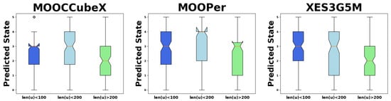 For all three datasets, when the record length is fewer than 200, the median predicted state is relatively high and the data distribution is more dispersed. In contrast, when the record length exceeds 200, the median predicted state is comparatively lower and the distribution is more concentrated. With longer input sequences, the LLM can better capture the input information, leading to more stable predictions. In summary, the LLM tends to produce moderate predictions in scoring tasks, remaining in a comfort zone to avoid extreme judgments. In comparison, KT does not suffer from this limitation and can more accurately predict students’ knowledge states. Therefore, we opt for the KT to evaluate students’ learning capabilities.