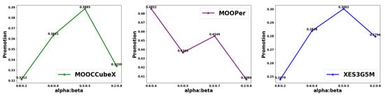 The KT in our framework involves two key hyperparameters, and (as defined in Equation (9)). We vary these parameters to examine their influence on model performance. The results are presented in Figure 5. When and are set to 0.5:0.5, the model achieves the best performance on the MOOCCubeX and XES3G5M datasets. However, increasing either or disproportionately leads to a significant drop in performance. The MOOPer dataset presents a more complex pattern. The model performs best when and are set to 0.6:0.4, while further adjustments cause noticeable fluctuations in performance. We attribute this to the larger number of knowledge components in MOOPer, which requires a more balanced consideration of prediction accuracy and item difficulty—an aspect that aligns more closely with real-world educational settings. These observations highlight the importance of dataset-specific parameter tuning, as appropriate values of and are crucial for optimizing model performance.