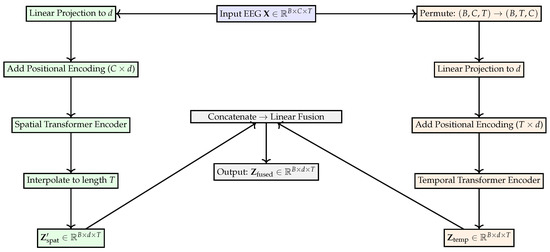 This fused embedding is transposed to the canonical format and passed to downstream components such as cross-attention, classification, and reconstruction heads. The fusion strategy allows the model to benefit from the complementary structure of both domains, ultimately leading to more robust EEG representations.
