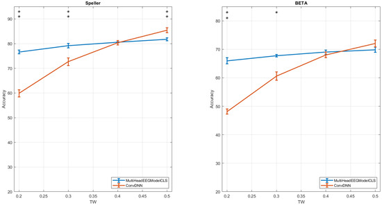 Figure 3. As illustrated, the MultiHeadEEGModelCLS method consistently demonstrates superior performance compared to the ConvDNN when we have small TWs. For example when TW = 0.2 s our method has achieved accuracy of 76% and 65% for the Speller and the BETA datasets respectively, while the ConvDNN below 60% for both datasets. Furthermore, a similar trend is observed when considering the Information Transfer Rate (ITR), as shown in