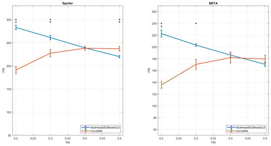 Figure 4. Notably, the MultiHeadEEGModelCLS method achieves the highest ITR in the majority of time windows, thereby highlighting its effectiveness under varying temporal constraints. Our method achieved its highest ITR (when TW = 0.2 s) of 283 bits/min and 222 bits/min for the Speller and BETA datasets, while, the ConvDNN achieved its highest ITR (in TW = 0.4 s) of 238 bits/min and 181 bits/min. Finally, the statistical analysis using paired