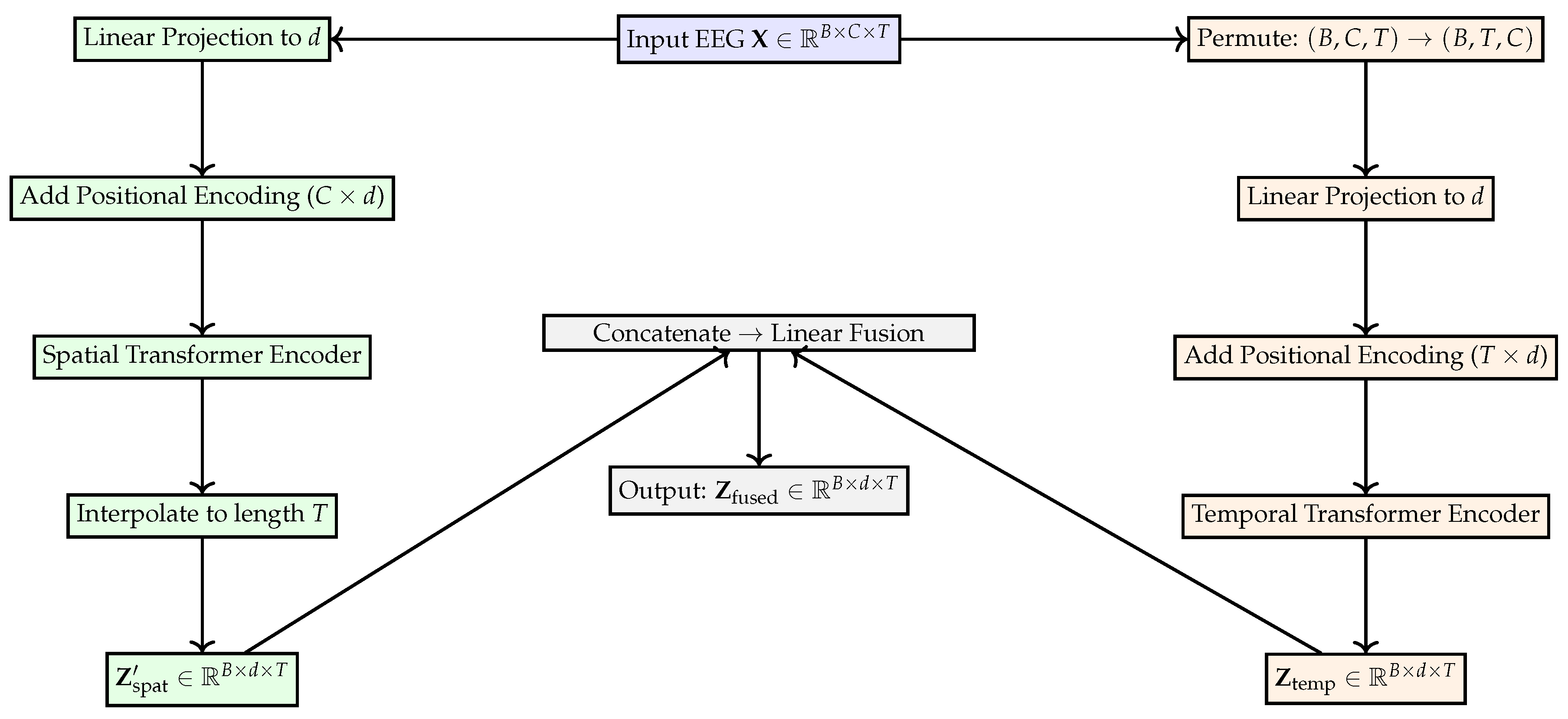The temporal stream is designed to extract temporal context and long-range dependencies across time for each EEG channel. The input tensor is first permuted to shape ( B , T , C ) so that each time step becomes an individual token composed of C-dimensional spatial information. This sequence is projected into a d-dimensional latent space via a linear transformation: