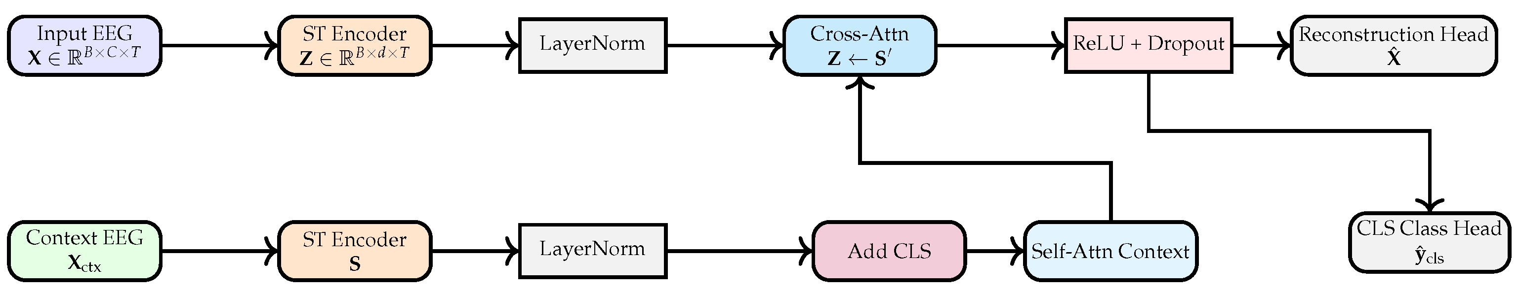 Let X R B × C × T denote the main EEG input, and X ctx R B × C × T be an optional context input (e.g., a reference or template), where B is the batch size, C the number of input channels, and T the number of time points.
