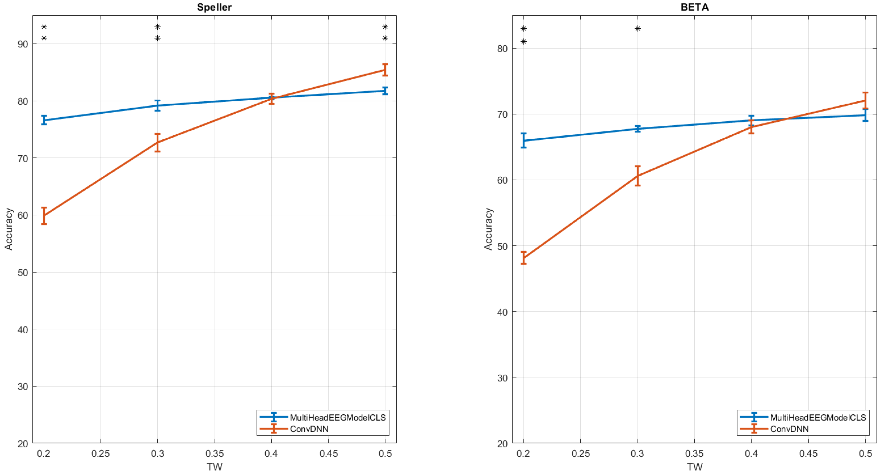 Figure 3. Averaged Classification Accuracy across all subjects by MultiHeadEEGModelCLS and ConvDNN in various time windows on Speller and BETA Datasets. The asterisks in subfigures indicate significant difference between two methods by paired t-tests (* p < 0.01 , ** p < 0.001 ). The error bars indicate standard errors.