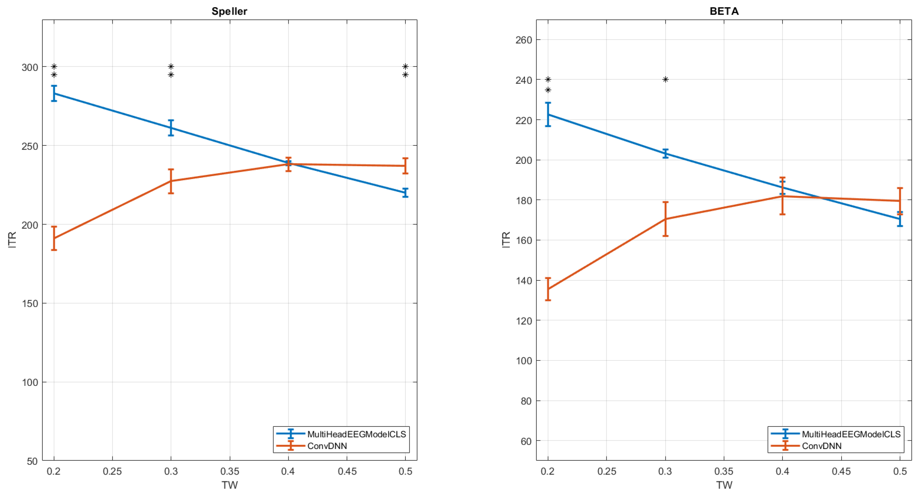 Figure 4. Averaged ITR across all subjects by MultiHeadEEGModelCLS and ConvDNN in various time windows on Speller and BETA Datasets. The asterisks in subfigures indicate significant difference between two methods by paired t-tests (* p < 0.01 , ** p < 0.001 ). The error bars indicate standard errors.