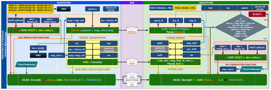 An A5/1-like structure (stream cipher) was not selected here because, due to its known cryptanalytic weaknesses, 64-bit key length, and non-obfuscated structure, the single root key can be obtained directly from RAM with greater likelihood [,]. In contrast, the proposed method increases the entropy and removes reliance on a root key by employing per-message 128-bit AEAD keys derived from (pool + root + device ID + [opt. timestamp/nonce]). In this context, the method introduces an original threat model and a dedicated solution that fill a gap in the literature.