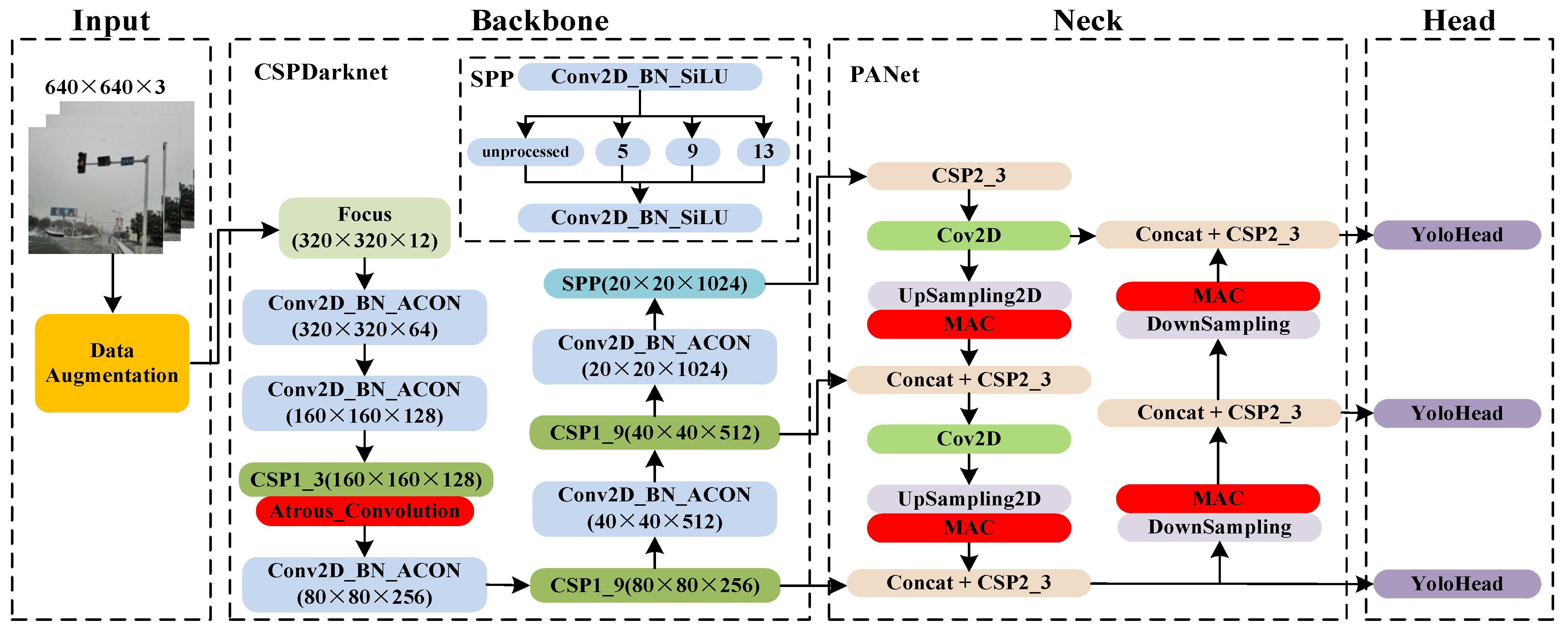 As illustrated in Figure 1, the enhanced MCA-YOLOv5-ACON model exhibits a distinct structural configuration. The input image at the Input side is data augmented into the CSPDarknet network as the Backbone of the model. The MCA attention module is embedded in the Path Aggregation Network (PANet) enhanced feature extraction network to serve as the neck of the model. The YOLOv5 convolutional module represents the initial component of the system responsible for feature extraction from images derived from any traffic signal video stream. The MCA mechanism is then able to identify the position and color of traffic signals within the image by assigning weights to its key features, thereby ultimately producing the desired result.
