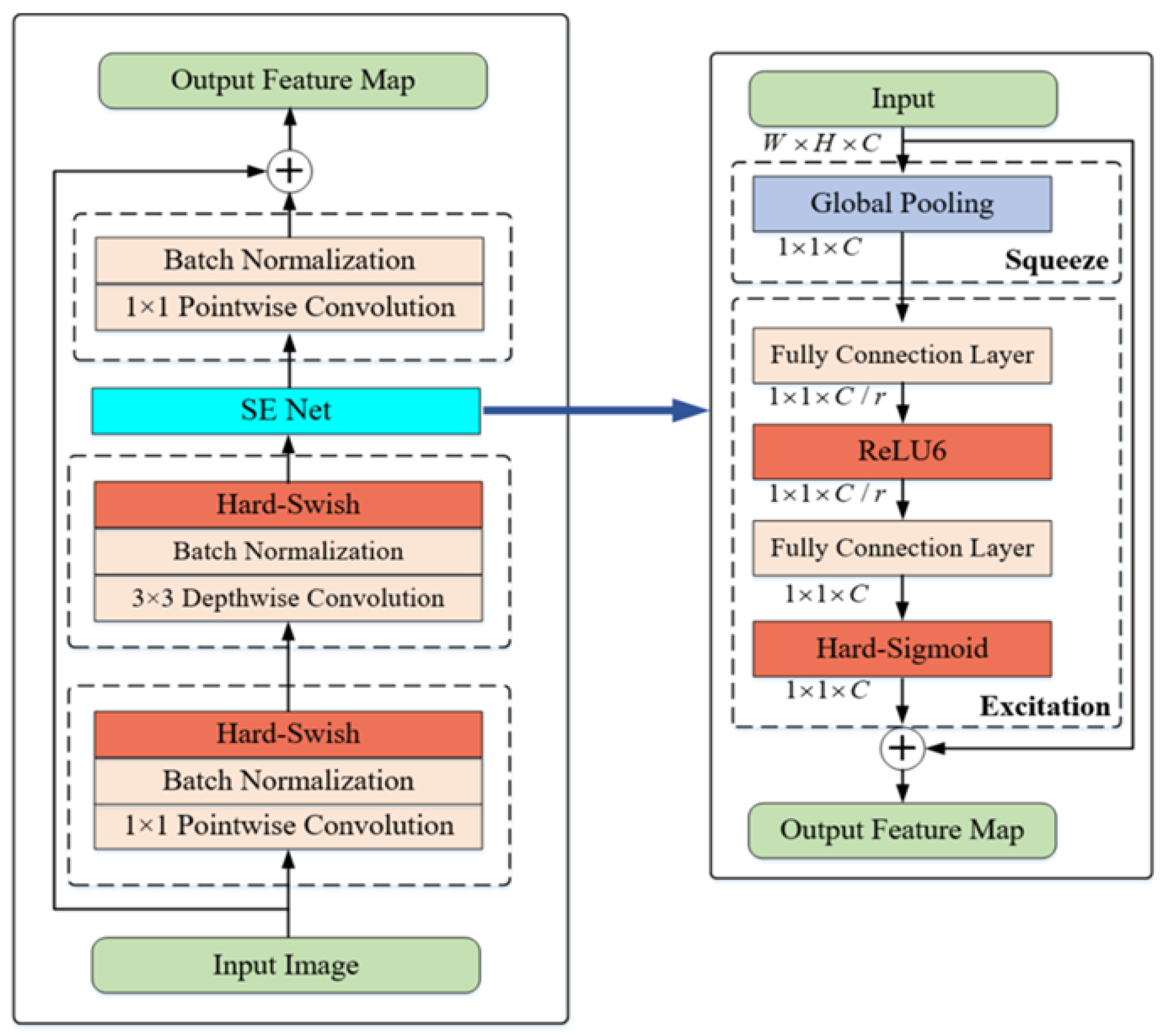 The MobileNetv3 network model has been enhanced in two distinct ways. In this study, a lightweight SENet was introduced into the Bneck structure of the network model with the aim of enhancing the quality of the output feature maps. The rationale behind this was that SENet was capable of learning the importance of each feature channel by modeling the interdependence between feature channels, and then based on the importance. The proposed enhancement would serve to accentuate the features that exerted a boosting effect on the prevailing training, and conversely, it would serve to suppress them. Conversely, novel Hard-Swish and Hard-Sigmoid activation functions were employed, which are delineated in Equations (3) and (4), respectively, where x denotes the input feature.
