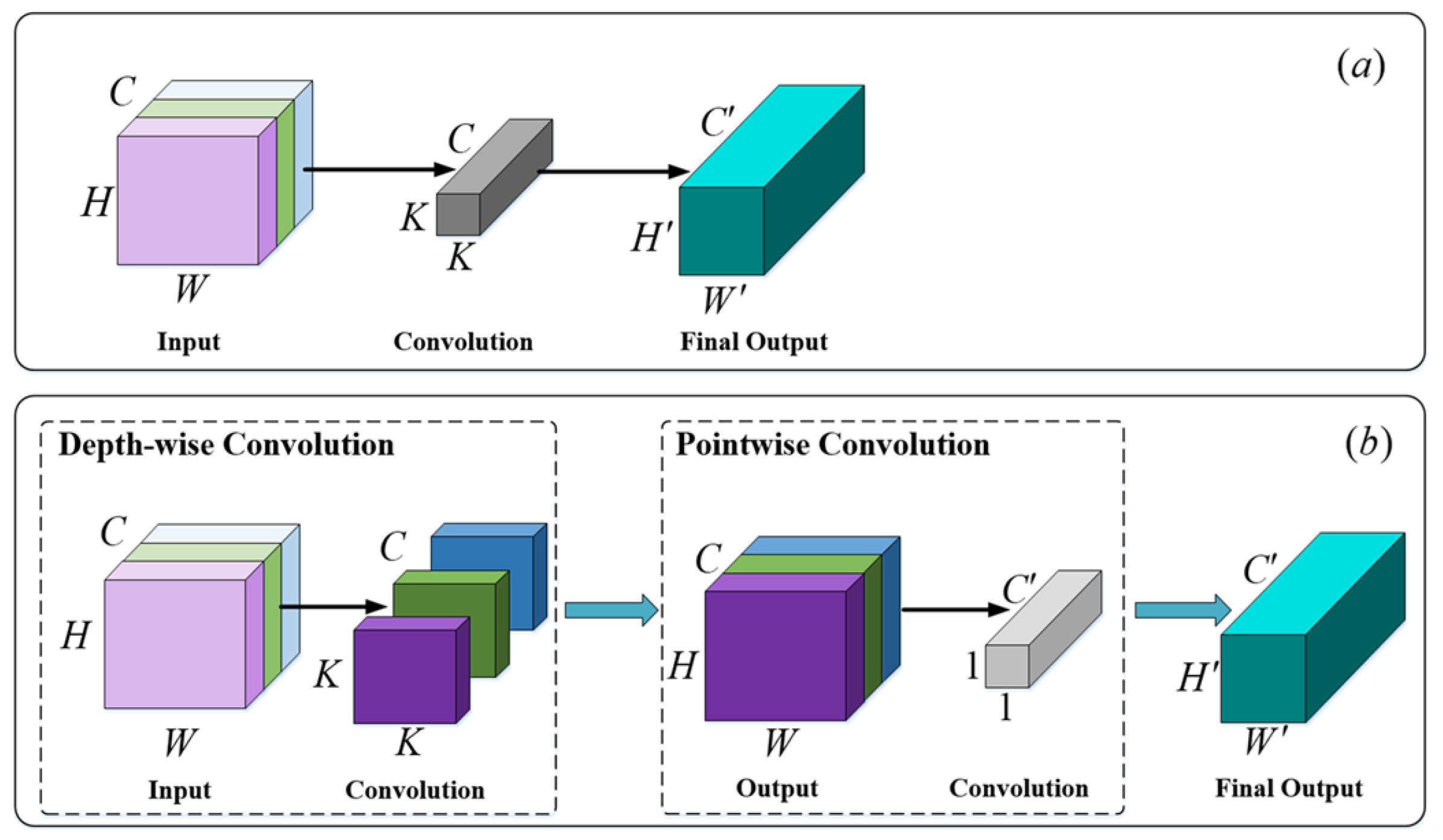 Figure 3. Ordinary Convolution and Depth-wise Separable Convolution. (a) Ordinary Convolution (b) Depth-wise Separable Convolution.