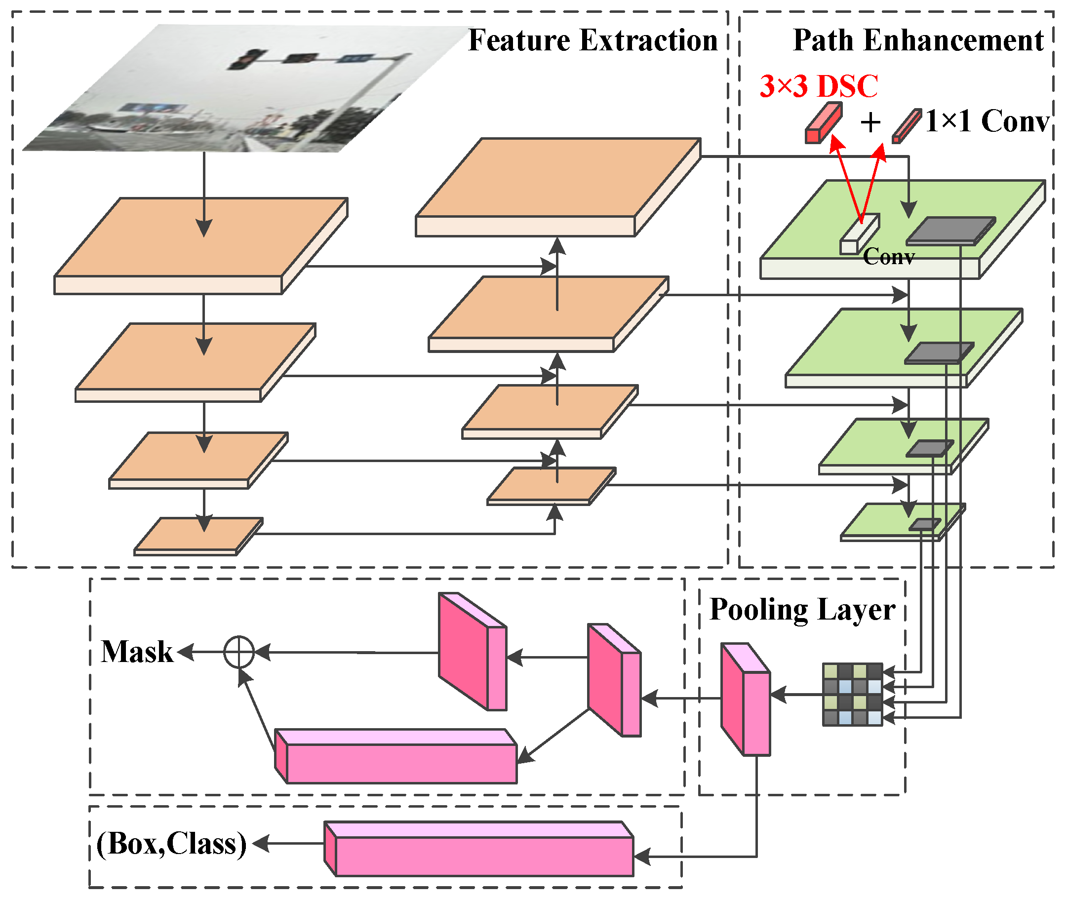 Secondly, an adaptive pooling layer has been developed to automatically reconstruct the missing information paths between all feature layers and each candidate box. Despite the simplicity of the pooling layer operation, it facilitates the aggregation of features from all feature layers within each candidate box. This approach circumvents the degradation of data quality and consistency that arises from arbitrary allocation.