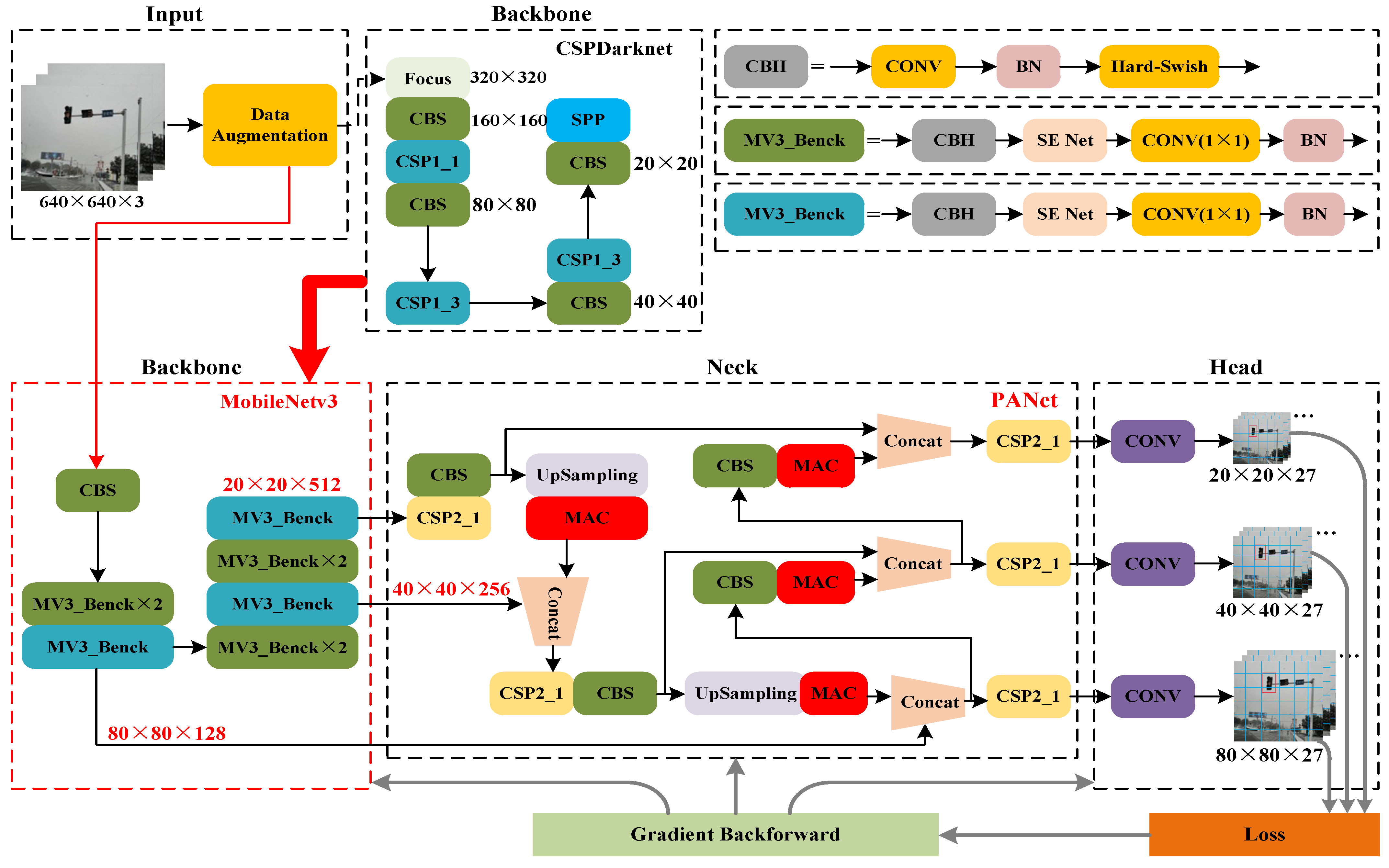 Despite the MCA-YOLOv5-ACON model’s capacity for precise identification of traffic signals in complex weather and road environments, the network structure is intricate and demands excessive computing resources, which makes it unsuitable for edge terminals. The MobileNet family of lightweight networks has been demonstrated to provide a comprehensive and efficient solution strategy. Consequently, this paper replaced the feature extraction network of the MCA-YOLOv5-ACON model with lightweight networks from the MobileNet family. In order to achieve further compression of the model, the PANet enhanced feature extraction network was also optimized by replacing its standard convolutional layers with deep separable convolutional blocks. The improved model not only achieved a significant reduction in parameters but also maintained high performance while accelerating video stream detection. The statistical data pertaining to the number of parameters for each model in the comparison experiment of this study are displayed in Table 1.