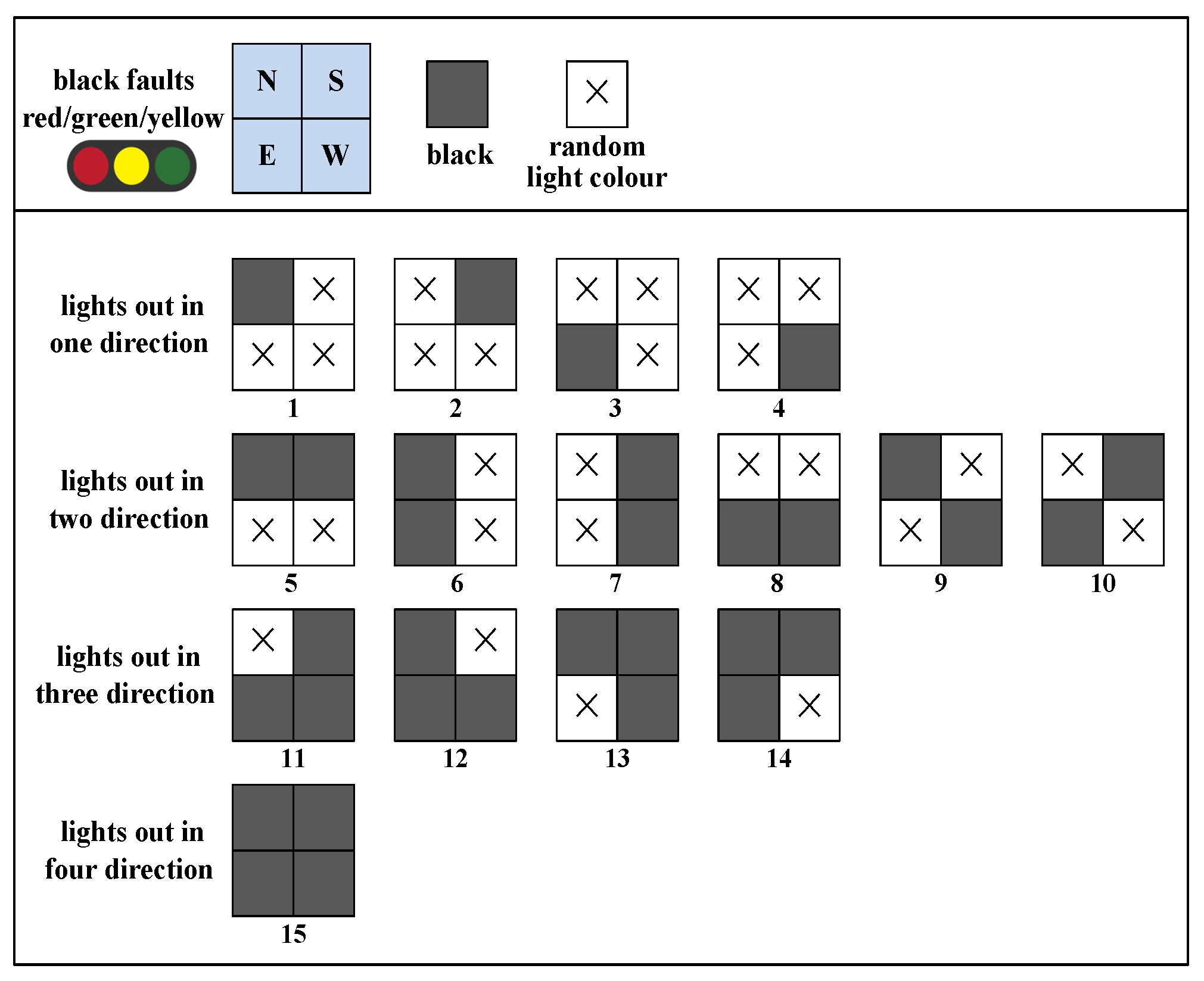 Furthermore, each direction of the black fault is subdivided into seven possible scenarios according to color. Assuming that the array (G, R, Y) represents the traffic signal board with green, red and yellow lights, it can be deduced that the value of 0 is assigned to black and 1 to light on. As illustrated in Table 3, the black fault situation is depicted for each direction.